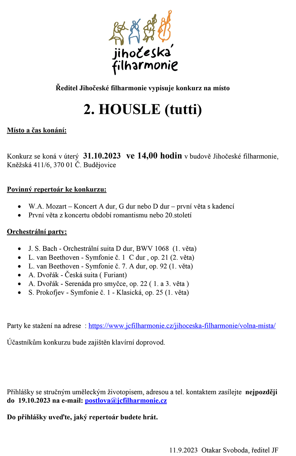 Inzerce Jihočeská filharmonie vypisuje konkurz na 2. housle (tutti) Publikováno 02/10/2023 sdílejte: 0 minut čtení sdílejte: TémataSeznam inzerátů Sdílet článek Facebook email zkopíruj odkaz vytisknout sdílejte: Předchozí článek Ve věku 25 let zemřela sopranistka Patricia Burda Janečková Další článek Zemlinského kvarteto vystoupí se španělským violistou Josepem Puchadesem 0 0 hlasy Ohodnoťte článek Odebírat Přihlášení Upozornit na nové a další komentáře nové odpovědi na můj komentář Label {} [+] Jméno* E-mail* Webová stránka Label {} [+] Jméno* E-mail* Webová stránka 0 Komentáře Nejstarší Nejnovější Most Voted Inline Feedbacks Zobrazit všechny komentáře Načíst další