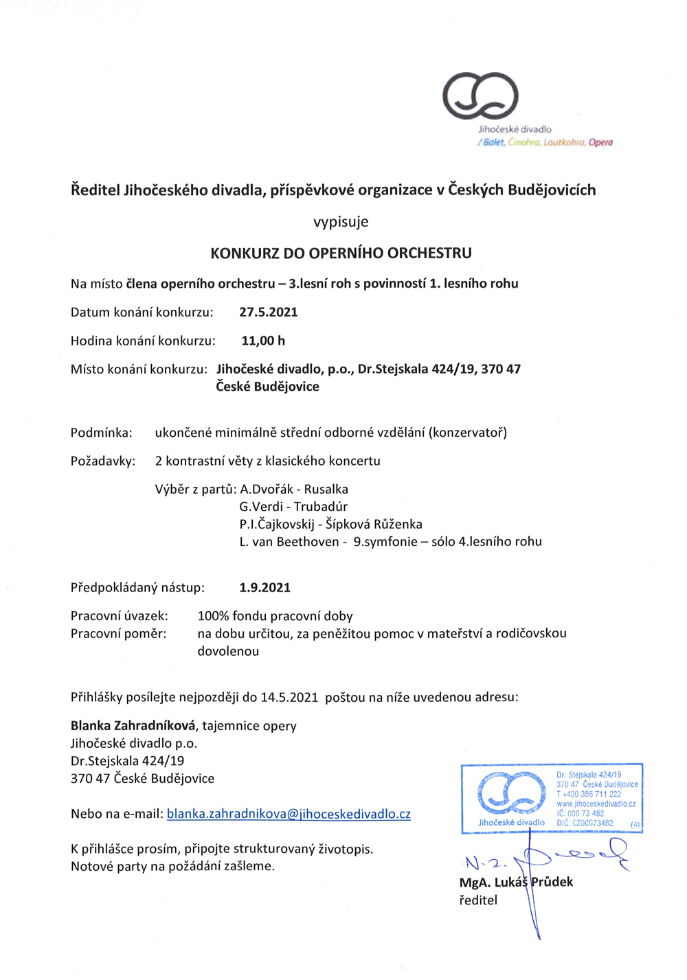Inzerce Jihočeské divadlo vyhlašuje konkurz na pozici 3. lesního rohu s povinností 1. lesního rohu Publikováno 28/04/2021 sdílejte: 0 minut čtení sdílejte: TémataSeznam inzerátů Sdílet článek Facebook email zkopíruj odkaz vytisknout sdílejte: Předchozí článek Jak nové vedení Slovenského národního divadla napravuje chyby svých předchůdců? Další článek Krvavý Don Giovanni ve Stavovském 0 0 hlasy Ohodnoťte článek Odebírat Přihlášení Upozornit na nové a další komentáře nové odpovědi na můj komentář Label {} [+] Jméno* E-mail* Webová stránka Label {} [+] Jméno* E-mail* Webová stránka 0 Komentáře Nejstarší Nejnovější Most Voted Inline Feedbacks Zobrazit všechny komentáře Načíst další