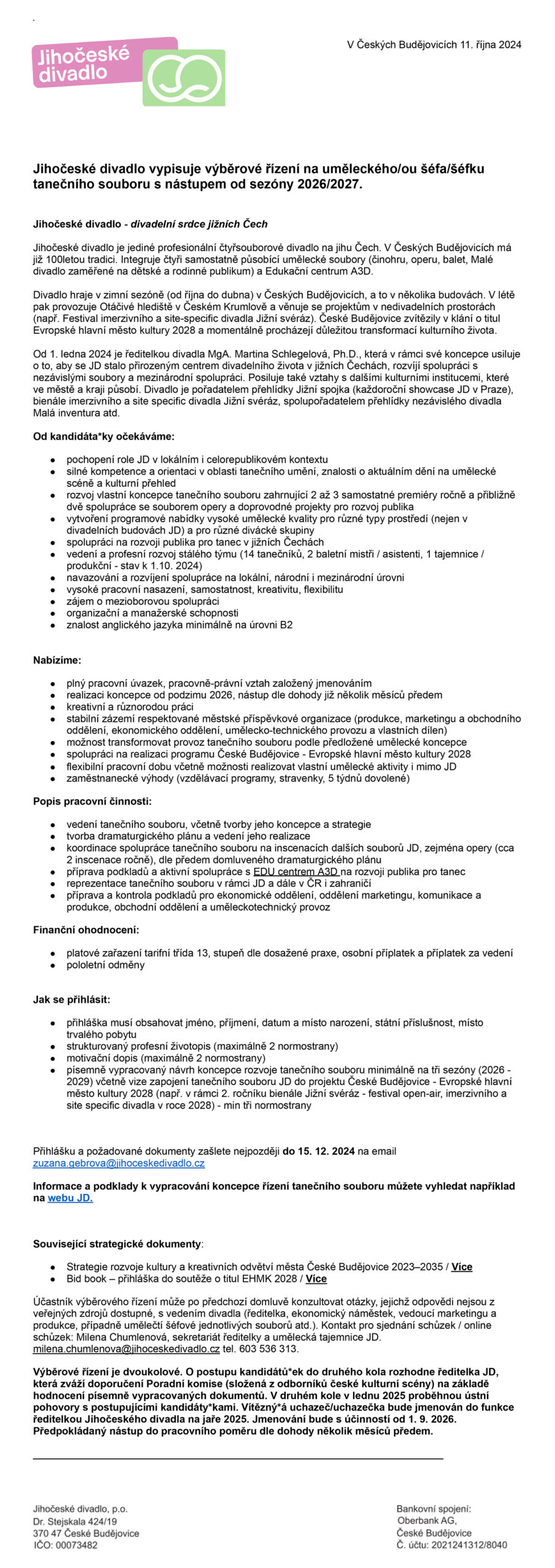 Čtení Jihočeské divadlo vypisuje výběrové řízení na uměleckého šéfa tanečního souboru