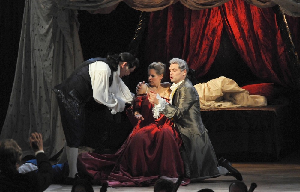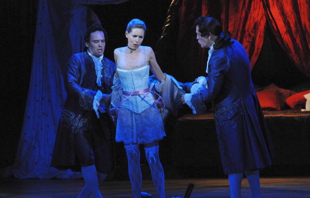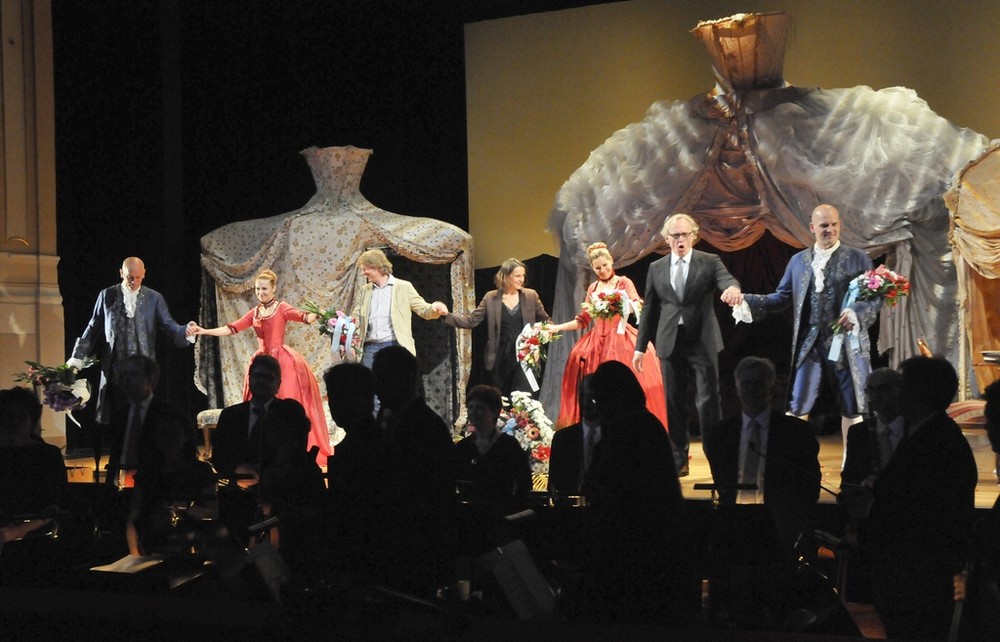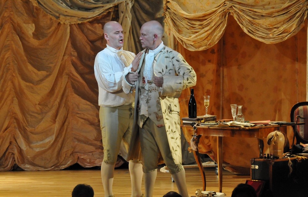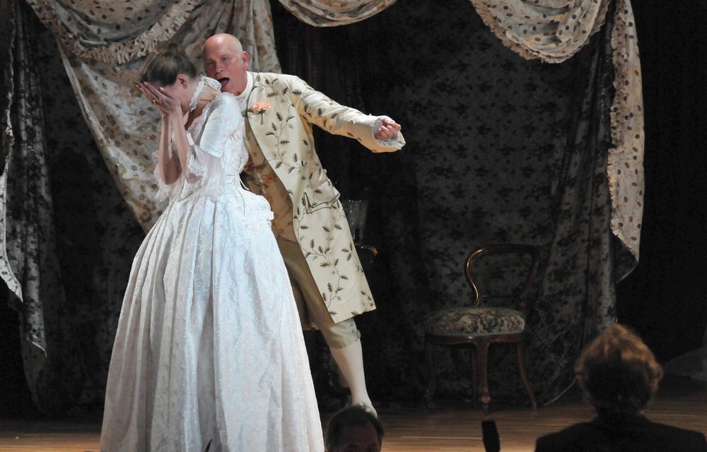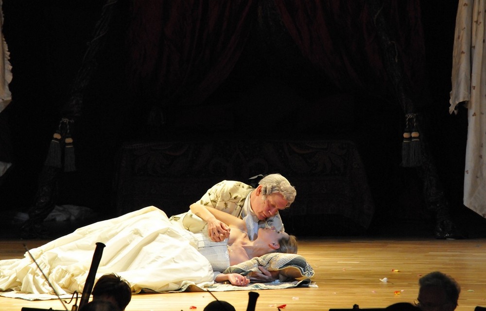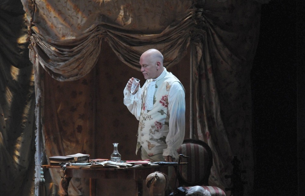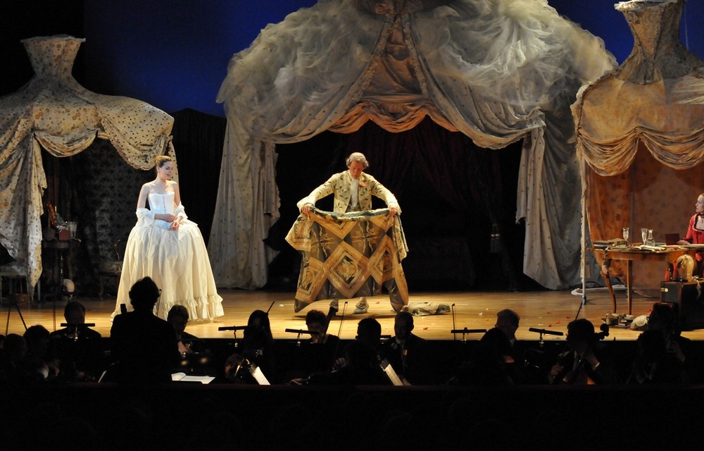 A jak to celé fungovalo? Zpočátku ani nevnímáte, že na jevišti nejsou čtyři operní sólisté, záměny a příchody nových postav, převleky a prolínání hudby s hereckou akcí působí kompaktně a přirozeně. Jednoduchou scénu (Renate Martin a Andreas Donhauser) tvoří tři obří krinolíny, jež slouží jako stan – a v něm se dají vytvářet různé variace na pokojíčky, ložnice, šatny, skrýše atd. Zajímalo mě, jak Michael Sturminger, autor textu a zároveň režisér představení, využije dvou hereckých hvězd a zda vymyslí něco nového, co běžně nevídáme na operních jevištích. Erotický námět jej vedl k tomu, že Malkovich je nejvíce exponován ve vášnivém líbání a zaobírání se ženskou garderobou, jakož i svou vlastní. V představení se stále někdo svléká, převléká, obléká, po jevišti se věčně válejí nějaké svršky, které je potřeba sbírat a uklízet. Malkovich je samozřejmě velký herec, jeho dlouhé a rytmické slovní kadence na jeden dech svědčí o jeho divadelním umění dostatečně. Škoda, že pochopit anglický a italský text v plné šíři bylo kvůli špatně čitelným titulkům českému divákovi odepřeno.  Některé pasáže z pamětí byly šokující svou otevřeností (o potratech, incestu aj.). Když si ale odmyslíme nepokrytě sexuální scény (jako znásilnění služky, nebo umělý penis v kalhotách Isabely předstírající, že je chlapec), nedělo se v režii zase nic tak objevného.