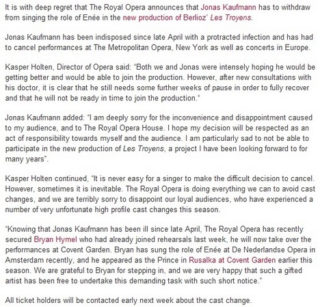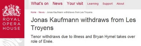 Sám Jonas Kaufmann mluví o dlouhodobé viróze, kterou trpí už od dubna. Smolné týdny přitom pokračují dál. Nejnověji se žádaný tenor teď rozhodl odříct svoji účast v nové inscenaci londýnské Královské opery, kde měl v Berliozových Trojanech ztvárnit roli Enéa. Tu za něj tak musí převzít Bryan Hymel. „Hluboce se omlouvám za vzniklé potíže a zklamání, které jsem svému publiku způsobil“, píše Kaufmann v prohlášení, které zveřejnila londýnská Covent Garden na svých webových stránkách. Lítostivé komentáře Kaufmannových truchlících fanoušků pod tímto prohlášením každým dnem přibývají ze všech koutů Evropy, včetně Česka.