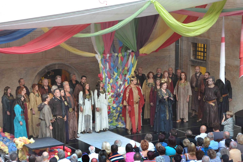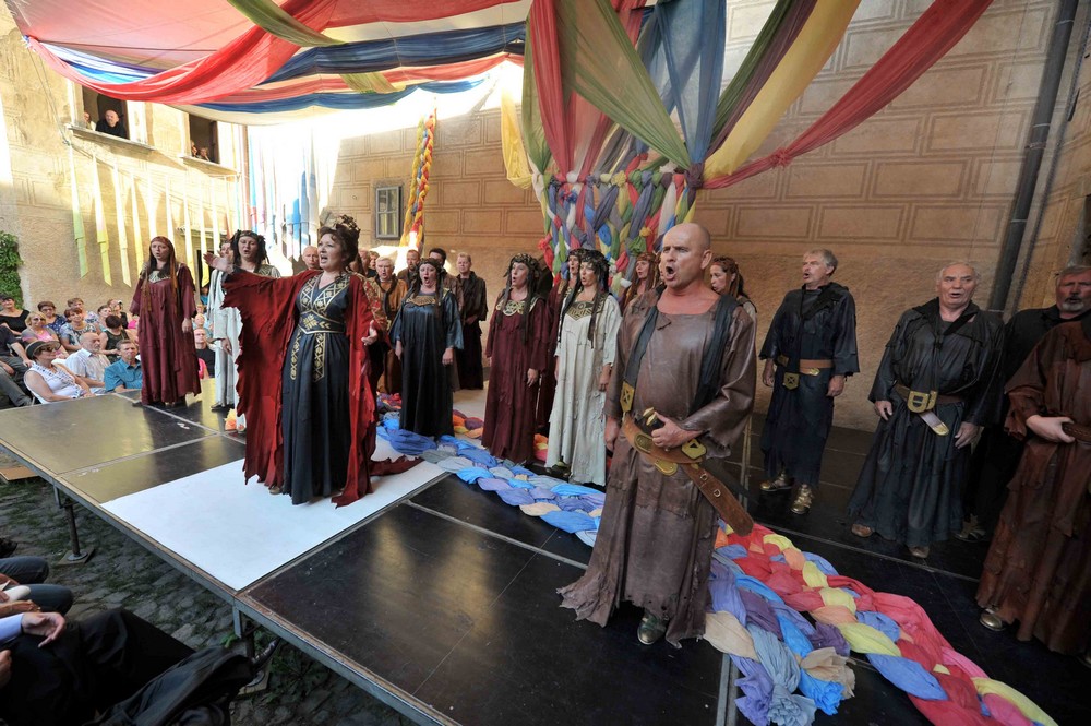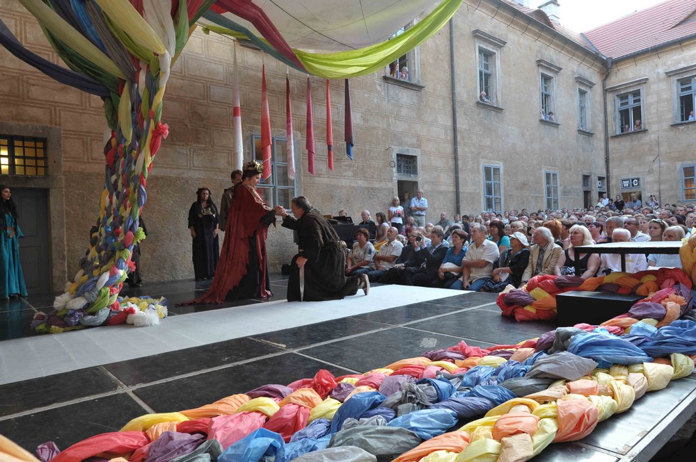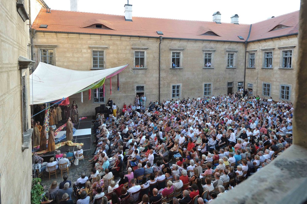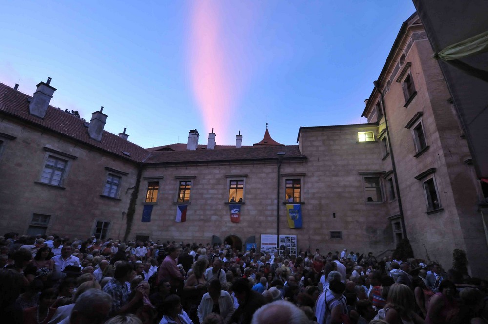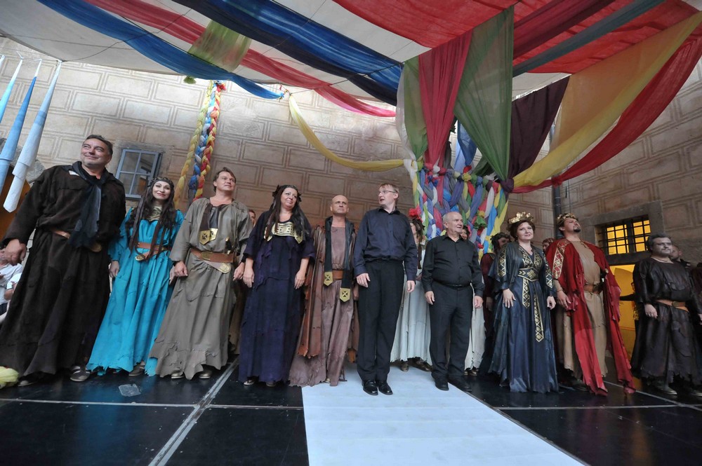Další náročnou záležitostí a také částečným handicapem je, že operní představení nejsou z prostorových i organizačních důvodů prováděna s orchestrem, ale pouze za doprovodu klavíru. Možná je to u tak velké opery poněkud nezvyklé, ale diváci si po chvíli jistě zvykli. Oproti tomu v některých momentech zase vyniknou hlasy pěvců. K pianu zasedli zkušený Jaroslav Šaroun a mladý dirigent David Švec, který také dílo řídil. Pod jeho taktovkou se hrála prakticky kompletní opera, vypuštěna byla pouze scéna žneců ve Stadicích a některé orchestrální předehry k jednotlivým obrazům, což ale nikterak nenarušilo kontinuitu děje. Hlavním atributem úspěchu představení na zámeckém nádvoří, přeplněném více než tisícovkou diváků, byl vyrovnaný sólistický ansámbl v čele s dnes již legendární Evou Urbanovou v titulní roli. Ta dala do postavy kněžny Libuše bytostně celé své velké pěvecké umění a hlavně nesmírný cit a prožitek. V některých okamžicích jsem si vybavil nezapomenutelnou Marii Podvalovou, jejíž Libuši jsem vídával v Národním divadle jako mladičký student a vzpomínka na ni se nesmazatelně zapsala v mé mysli. Dokonalým partnerem naší současné operní heroiny byl urostlý Přemysl Martina Bárty, jehož krásný nosný baryton pronikal v plné síle až do nejzazších koutů zámeckého nádvoří. Z dalších protagonistů, kteří mají své role nastudované z pražské inscenace, je především nutno uvést sonorního Luďka Veleho jako Chrudoše, Jitku Svobodovou v roli Krasavy a Radmilu Kateřiny Jalovcové. Výborně se pěvecky i výrazově uplatnil Aleš Briscein jako Šťáhlav, který sice v pražské inscenaci obsazen není, ale ztvárnil již stejnou roli před dvěma lety při uvedení Libuše v přírodním amfiteátru v pražské Šárce. Radovana pak zpíval Jiří Kubík a Lutobora mladý Michael Kubečka, který jako jediný ani v jednom z pražských uvedení Libuše nevystupoval. Na všech sólistech i členech sboru Národního divadla bylo vidět radost z prováděného díla a snahu o maximální výkon i za ztížených podmínek enormně horkého dne. Sílu a chuť jim jistě dodávalo velmi vděčné a ukázněné publikum. Při závěrečných slovech Libušina proroctví Můj drahý český národ neskoná, on pekla hrůzy slavně překoná mnohým z diváků vytryskly slzy z očí. Závěrečný potlesk a standing ovations jen potvrdily opravdové nadšení obecenstva.