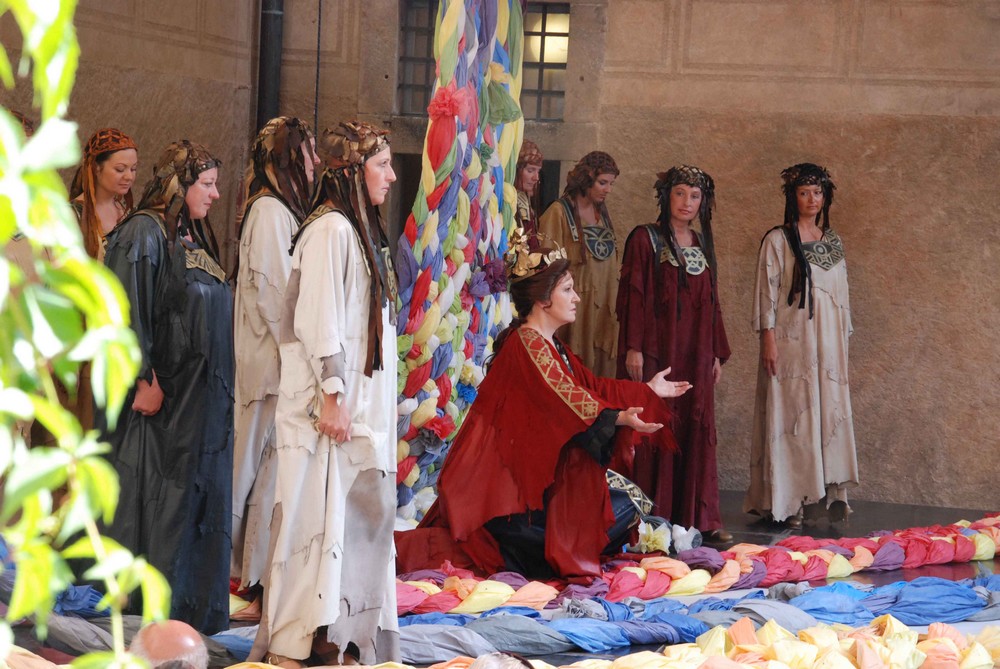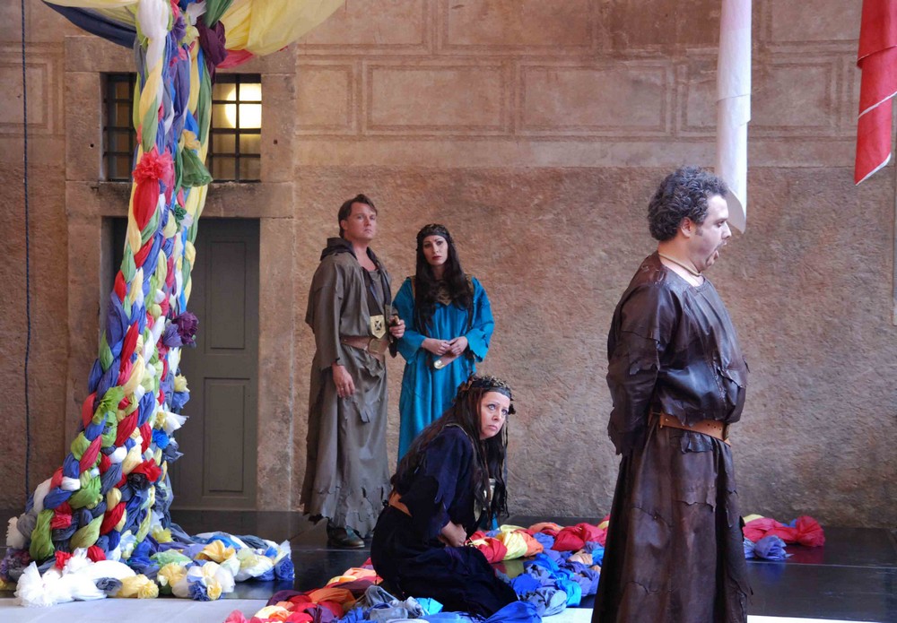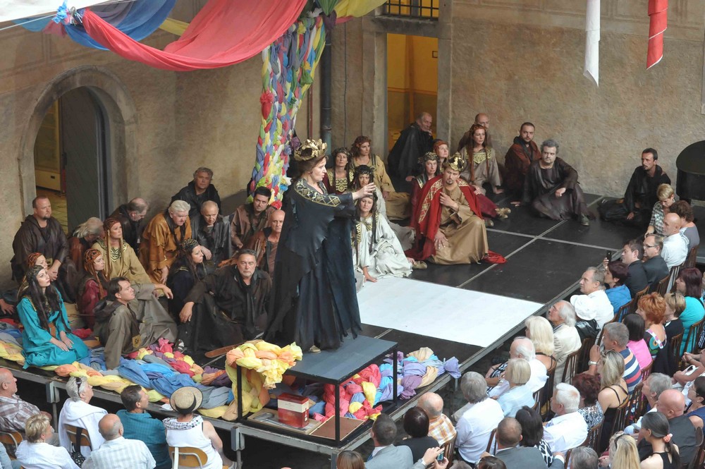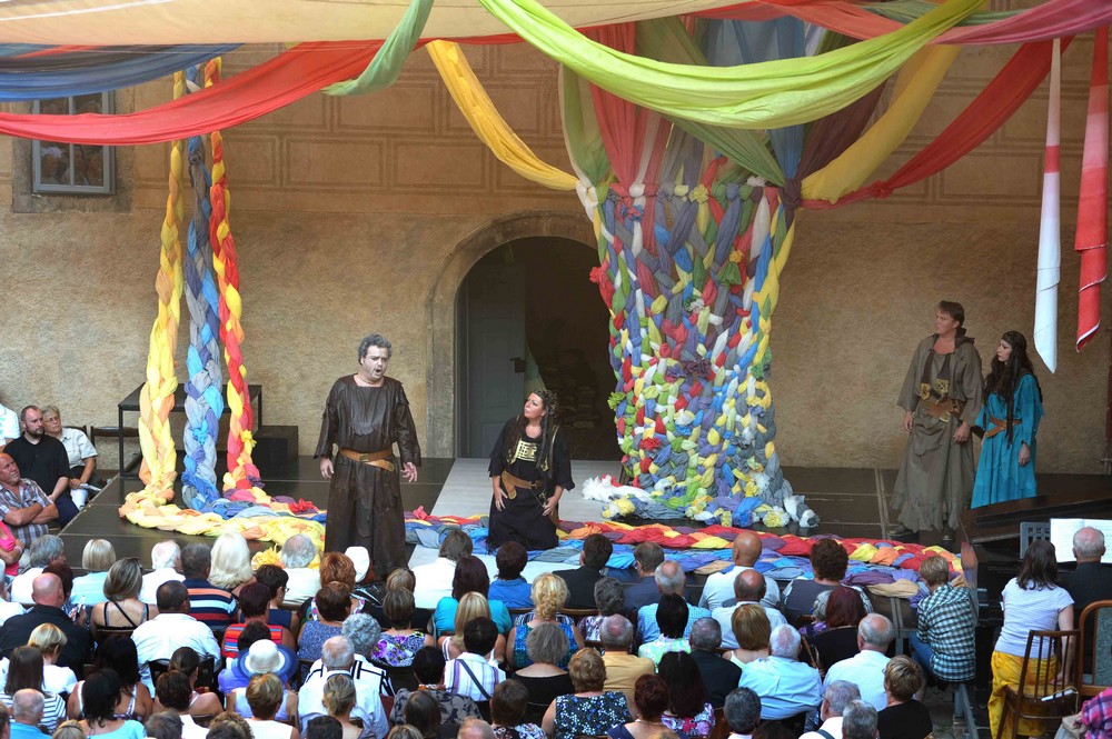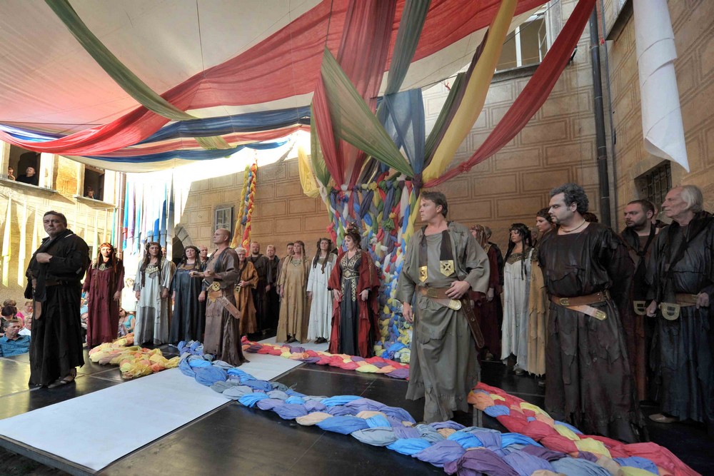 Další náročnou záležitostí a také částečným handicapem je, že operní představení nejsou z prostorových i organizačních důvodů prováděna s orchestrem, ale pouze za doprovodu klavíru. Možná je to u tak velké opery poněkud nezvyklé, ale diváci si po chvíli jistě zvykli. Oproti tomu v některých momentech zase vyniknou hlasy pěvců. K pianu zasedli zkušený Jaroslav Šaroun a mladý dirigent David Švec, který také dílo řídil. Pod jeho taktovkou se hrála prakticky kompletní opera, vypuštěna byla pouze scéna žneců ve Stadicích a některé orchestrální předehry k jednotlivým obrazům, což ale nikterak nenarušilo kontinuitu děje. Hlavním atributem úspěchu představení na zámeckém nádvoří, přeplněném více než tisícovkou diváků, byl vyrovnaný sólistický ansámbl v čele s dnes již legendární Evou Urbanovou v titulní roli. Ta dala do postavy kněžny Libuše bytostně celé své velké pěvecké umění a hlavně nesmírný cit a prožitek. V některých okamžicích jsem si vybavil nezapomenutelnou Marii Podvalovou, jejíž Libuši jsem vídával v Národním divadle jako mladičký student a vzpomínka na ni se nesmazatelně zapsala v mé mysli. Dokonalým partnerem naší současné operní heroiny byl urostlý Přemysl Martina Bárty, jehož krásný nosný baryton pronikal v plné síle až do nejzazších koutů zámeckého nádvoří. Z dalších protagonistů, kteří mají své role nastudované z pražské inscenace, je především nutno uvést sonorního Luďka Veleho jako Chrudoše, Jitku Svobodovou v roli Krasavy a Radmilu Kateřiny Jalovcové. Výborně se pěvecky i výrazově uplatnil Aleš Briscein jako Šťáhlav, který sice v pražské inscenaci obsazen není, ale ztvárnil již stejnou roli před dvěma lety při uvedení Libuše v přírodním amfiteátru v pražské Šárce. Radovana pak zpíval Jiří Kubík a Lutobora mladý Michael Kubečka, který jako jediný ani v jednom z pražských uvedení Libuše nevystupoval. Na všech sólistech i členech sboru Národního divadla bylo vidět radost z prováděného díla a snahu o maximální výkon i za ztížených podmínek enormně horkého dne. Sílu a chuť jim jistě dodávalo velmi vděčné a ukázněné publikum. Při závěrečných slovech Libušina proroctví Můj drahý český národ neskoná, on pekla hrůzy slavně překoná mnohým z diváků vytryskly slzy z očí. Závěrečný potlesk a standing ovations jen potvrdily opravdové nadšení obecenstva.