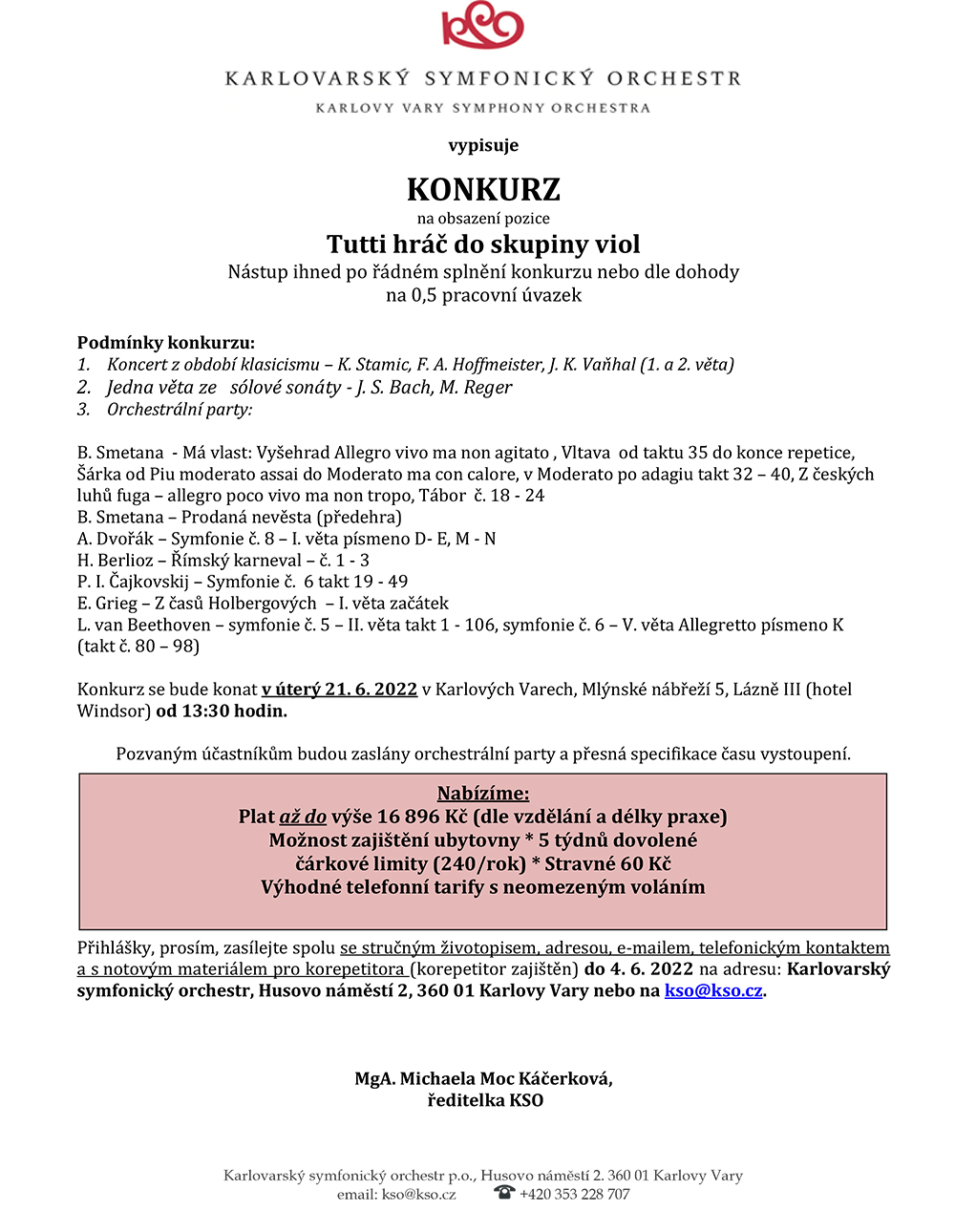 Inzerce Karlovarský symfonický orchestr vypisuje konkurz na obsazení pozice Tutti hráč do skupiny viol Publikováno 18/04/2022 sdílejte: 0 minut čtení sdílejte: TémataSeznam inzerátů Sdílet článek Facebook email zkopíruj odkaz vytisknout sdílejte: Předchozí článek Týden s hudbou. Koncerty, divadelní představení, online záznamy i streamy Další článek Koncertní sál v Nashvillu se kvůli ptákům potýká s existenční hrozbou 0 0 hlasy Ohodnoťte článek Odebírat Přihlášení Upozornit na nové a další komentáře nové odpovědi na můj komentář Label {} [+] Jméno* E-mail* Webová stránka Label {} [+] Jméno* E-mail* Webová stránka 0 Komentáře Nejstarší Nejnovější Most Voted Inline Feedbacks Zobrazit všechny komentáře Načíst další