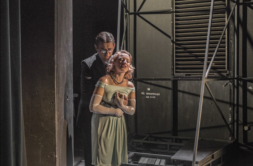 Trochu rozporuplné je hrať operu bez prestávky, keď nie je kontinuita dejstiev formálne zachovaná a každé dejstvo rámcujú manévre: zatvorí sa opona, orchester začne ladiť a potom sa pokračuje. Ak prvé dejstvo pôsobí statickou veľkoleposťou advokátskej kancelárie Kolenatého s výhľadom na Prahu, režisérova koncepcia vezme túto našu istotu za svoje. S druhým dejstvom v divadelnom zákulisí predvedie Radok zákulisie svojej koncepcie, či priamo túto koncepciu. Všetky naše istoty sa rozpadnú a my začíname bádať, čo to znamená. Aký symbol sa za tým skrýva. Jednotlivé steny sa posúvajú, vytvárajú viac než vizuálne krásne obrazy, ktoré predstavujú režisérovu skladačku inteligencie a symbolov, ale aj oné zákulisie druhého dejstva predpísané od autora. Tento kľúč vytvorí aj lokácie zastrčeného hotelíka, kde Emília strávi noc s Prusom a prezradí všetky svoje tajomstvá. Ale už to nie je istota jednoty času a priestoru, je to rafinovaná magická hra. A keď Elina už nie Emília neumiera, ale zatvára za sebou oponu, tento banálny trik sa stáva výkričníkom viac než efekty iných tvorcov ako ju zniesť zo sveta a čo s receptom „vecou“ Makropulos.