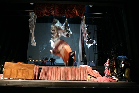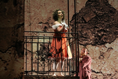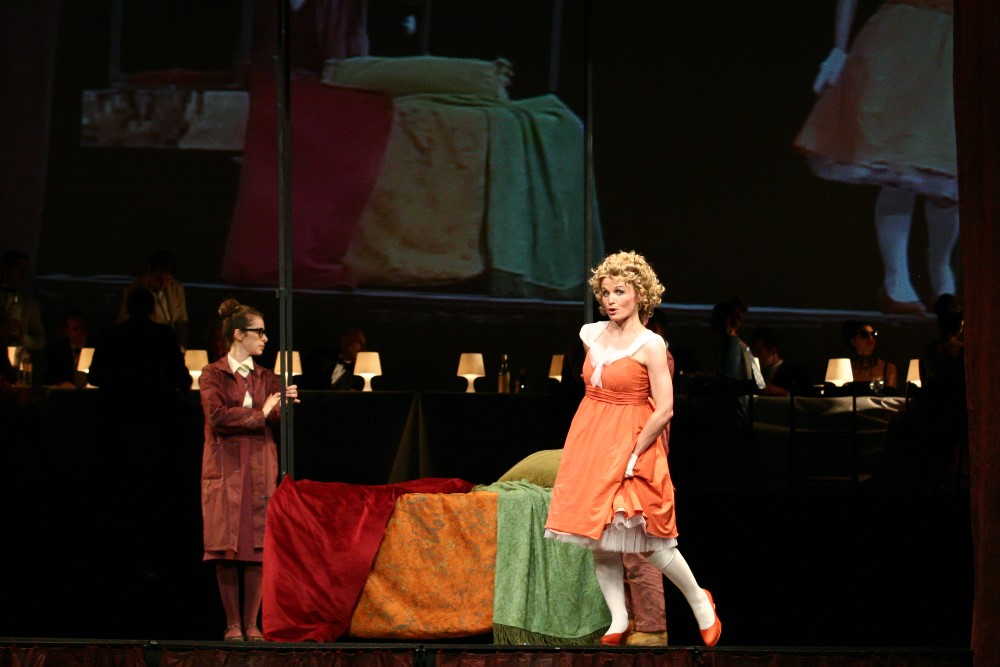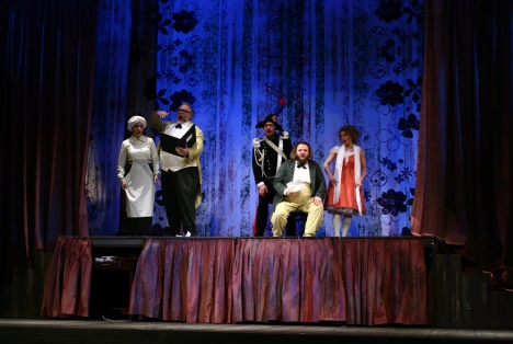 Roman Polák nenašiel v samotnom príbehu žiadnu filozofiu, nuž začal vymýšľať o aké baličky sa oprie. Spolu so scénografom Pavlom Borákom a kostýmovým výtvarníkom Petrom Čaneckým pritom nechceli byť ani príliš revoluční ani tradiční, nemienili akcentovať ponášku na prvky commedie dell´arte ani ju odvrhnúť, chceli diváka zabaviť ale aj podsunutím spoločensko-kritického ostňa previazať príbeh s dneškom. Model „divadla na divadle“ býva často používanou pomôckou a je už len na inscenátoroch, či ju dokážu opuncovať originalitou. Nové javisko postavené na pôvodnom navádza pocit návratu k pouličnému barokovému divadlu, pobehujúci a skarikovaný personál sa snaží o elimináciu odcudzujúcej bariéry medzi pridaným javiskom a reálnym publikom. Pokiaľ by v ich konaní boli nápady a nielen rušivý hluk, prečo nie. Podobne aj idea pridanej roviny v Polákovej koncepcii, spoločenskej smotánky, ktorá si zakúpi zinscenovanie opery (vzdialená pripomienka Straussovej Ariadny na Naxe), by za istých okolností mohla pôsobiť ozvláštňujúco. Jej aplikácia prostredníctvom projekcie, narúšajúcej napríklad dominantnú áriu Rosiny „Una voce poco fa“ (navyše spievanú na hojdačke), bola kontraproduktívna a len priklincovala Polákovu neochotu inšpirovať sa hudbou. Režisérovo „majstrovstvo“ vo vytváraní speváckeho diskomfortu kulminovalo v duete Rosiny a Figara „Dunque io son…“), kde obaja predstavitelia museli počas ozdobného spevu skákať na posteli ako na trampolíne. Isteže, Rossini akrobatom je, avšak vokálnym, nie cirkusovým. Väčšina Polákových gagov mi pripadala ako dosť naivné maskovanie bezradnosti. Tam, kde predloha sama osebe má dostatok prirodzeného vtipu, privyrobené akcie pôsobili umelo a nespontánne. A to pôvodné ostalo nepovšimnuté. Zväčša tmavý horizont a málo diferencované svietenie príliš nereflektujú gracióznu a optimistickú Rossiniho hudbu. Režisér dokonca ani nedoprial zaslúžený potlesk Rosine po druhej árii „Contro un cor“, keď po jej doznení nechal vzbĺknuť klavír a hasiaci prístroj spolu s rútiacim sa horizontom spôsobili odporný rachot. Dažďových prehánok bolo počas 2.dejstva nadbytok, no paradoxne, búrka ostala v suchu.