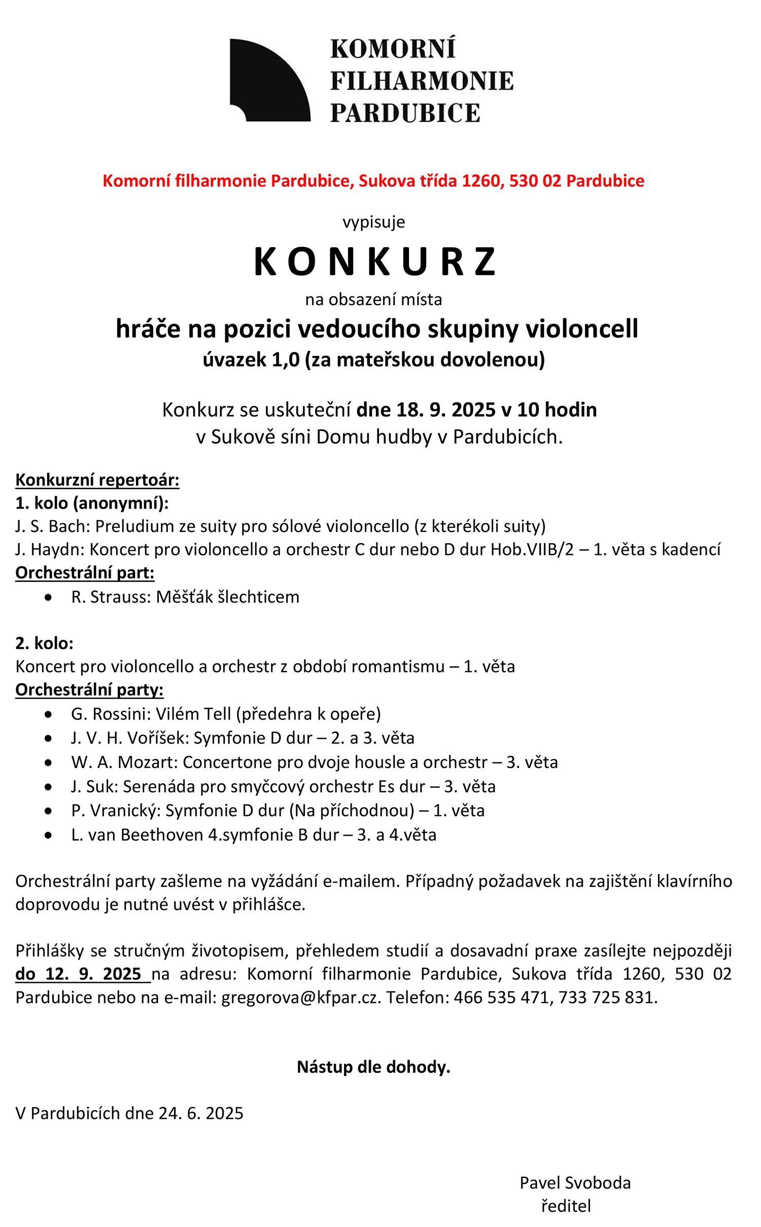 Inzerce Komorní filharmonie Pardubice přijme vedoucího skupiny violoncell Publikováno 27/06/2025 sdílejte: 0 minut čtení sdílejte: TémataSeznam inzerátů Sdílet článek Facebook email zkopíruj odkaz vytisknout sdílejte: Předchozí článek Interpretace není konflikt rozumu a citu – je to jejich integrace, říká klavírista Pierre-Laurent Aimard Další článek Ostatky skladatele Jaromíra Vomáčky se vrátily do vlasti 0 0 hlasy Ohodnoťte článek Odebírat Přihlášení Upozornit na nové a další komentáře nové odpovědi na můj komentář Label {} [+] Jméno* E-mail* Webová stránka Label {} [+] Jméno* E-mail* Webová stránka 0 Komentáře Nejstarší Nejnovější Most Voted Inline Feedbacks Zobrazit všechny komentáře Načíst další