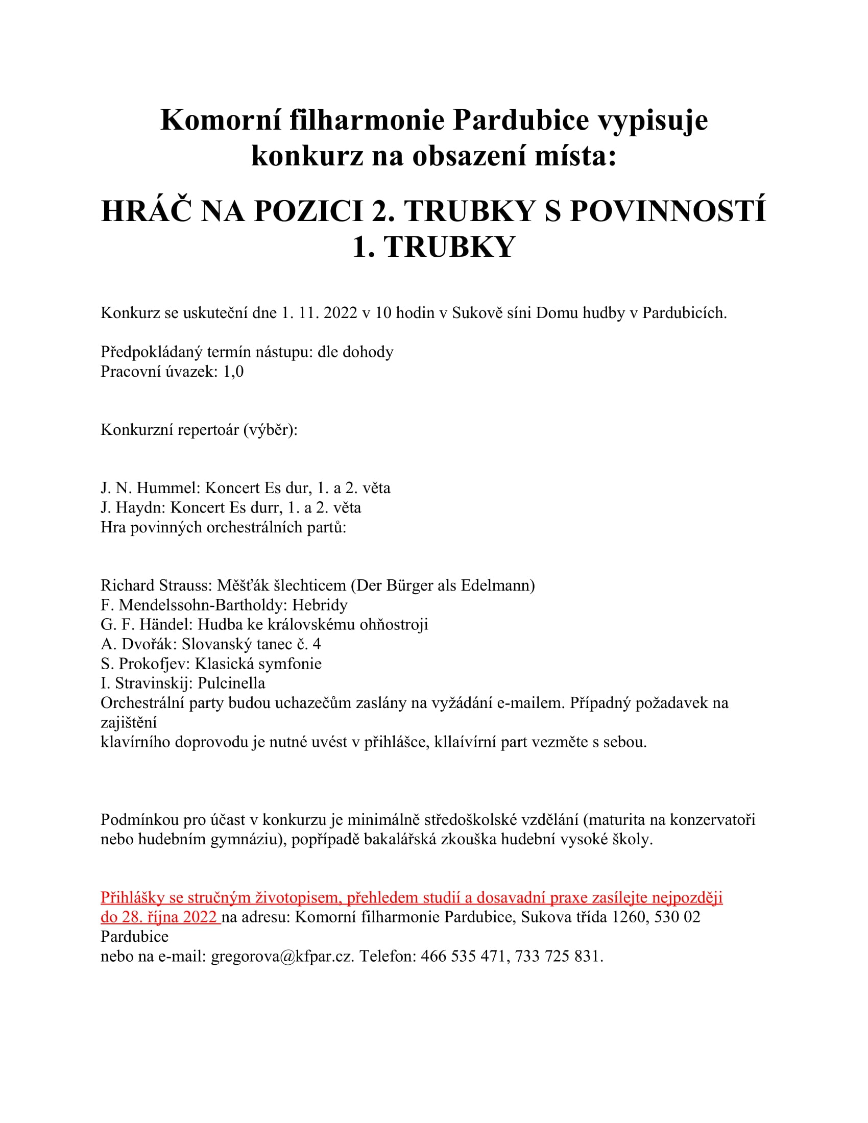 Inzerce Komorní filharmonie Pardubice vypisuje konkurz na pozici 2. trubky s povinností 1. trubky Publikováno 05/10/2022 sdílejte: 0 minut čtení sdílejte: TémataSeznam inzerátů Sdílet článek Facebook email zkopíruj odkaz vytisknout sdílejte: Předchozí článek Vyšla nová kniha Verdi a Wagner na slovenských operních scénách Další článek Na Festival F. L. Věka se po šesti letech vrací Kvarteto Apollon a Claudio Mansutti 0 0 hlasy Ohodnoťte článek Odebírat Přihlášení Upozornit na nové a další komentáře nové odpovědi na můj komentář Label {} [+] Jméno* E-mail* Webová stránka Label {} [+] Jméno* E-mail* Webová stránka 0 Komentáře Nejstarší Nejnovější Most Voted Inline Feedbacks Zobrazit všechny komentáře Načíst další