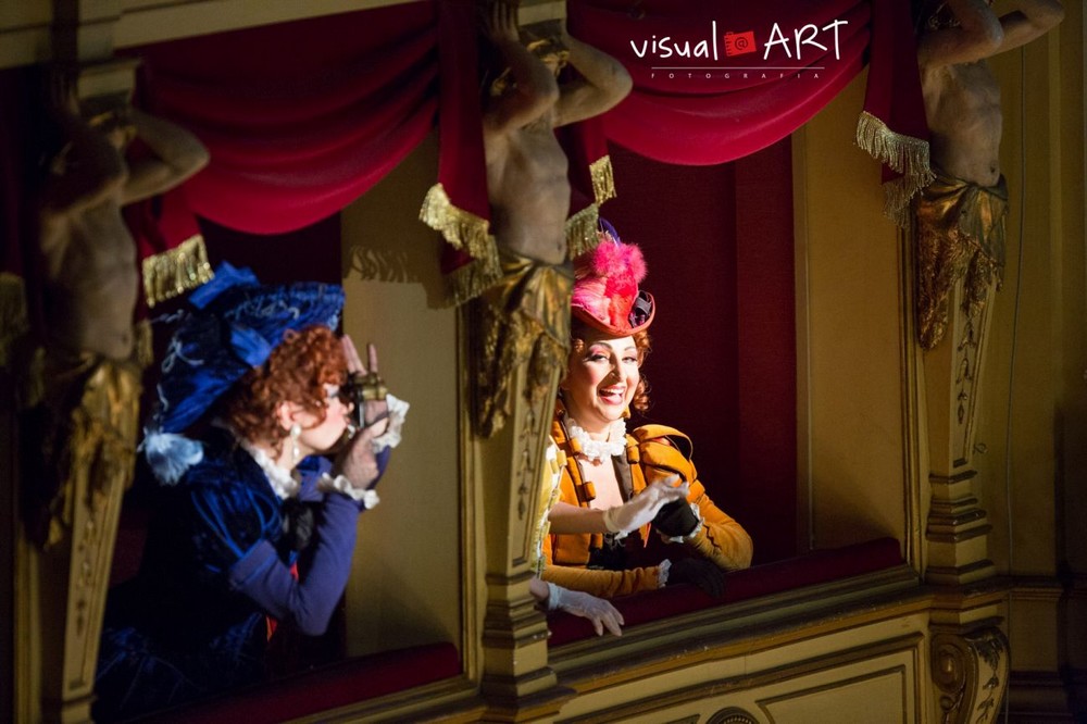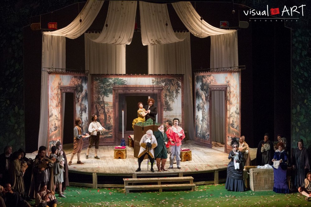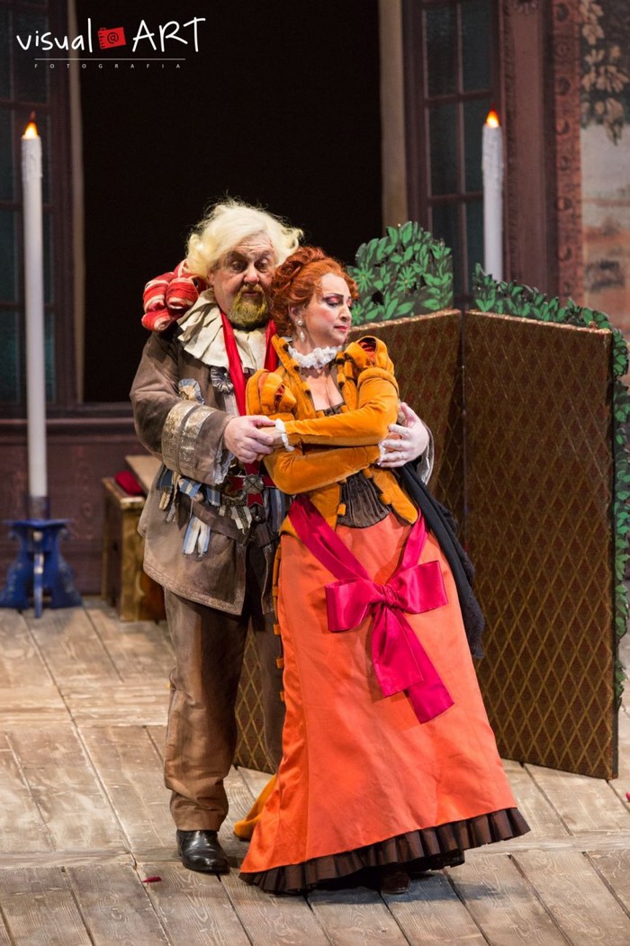 Jak se ukázalo, nikoliv samoúčelně. Režisér totiž rozehrál falstaffovský příběh především v duchu commedie dell’arte, takže se nezdráhal využívat ani prvků prvoplánové komiky a značně hrubozrnných gagů. Došlo i na „humorný“ přístup k nejrůznějším tělesným nedostatkům či vyměšování. Aby to však primárně nevyznělo jako odsudek: Verdiho opera podle Shakespearových Veselých paniček windsorských sice nese označení „lyrická komedie“, ale charakterem hudby i děje by se docela dobře mohlo jednat i o klasickou „buffu“. V opulentních kostýmech, čerpajících inspiraci v oděvech z období od renesance až po biedermeier (návrhy od Zairy de Vincentiis), se tak protagonisté pouštěli do eskapád, které byly většinou zručně zaranžované a rozhodně nenudily. Příkladem budiž například scénka, kdy paní Quickly – v režisérově pojetí i s Nannettou – přichází do hostince za Falstaffem, aby mu předala pozvání k tajné schůzce s paní Fordovou. Obě ženy předstírají, že jsou nevidomé, takže je zdobí černé brýle a bílá hůl. Zatímco polichocený svůdník Quicklyové naslouchá, olupují jeho sluhové Bardolfo a Pistola obě ženy nejen o vyžebrané drobné mince v plechovce, ale Nanettu i o brýle. Ty si ovšem dívka při odchodu zase „ukradne“ zpátky… V následující scéně zase přestrojený Ford simuluje, že má jednu nohu dřevěnou, a když mu (jako domnělému panu Fontanovi) Falstaff s gustem prozradí, že se chystá na milostné dostaveníčko s paní Fordovou, začne překvapený paroháč dopadat na jinou nohu, než předtím. Úplatní sluhové se čas od času stávají psíky na Fordově a Cajusově vodítku (a psíci, jak známo, musí občas zvednout nožku, aby vykonali potřebu), ve scéně pátrání po Falstaffovi v ložnici paní Fordové jsou naopak Ford s Cajusem honícími psy, jež Bardolfo s Pistolem udrží na řetězu jen tak tak…