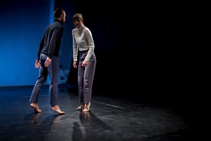 V okamžiku, kdy se performance stává duetem, přichází také více prostoru pro otázky. Je tanečnice zosobněním ztracené blízké osoby a doplňuje nyní neúplný prostor, který zůstal po předčasném odtržení? Je taková náhrada plnohodnotná? A nutná? A potřebná? Duet se rozvíjí v doslova krásném partneringu, v citlivých dotecích a přelévání energie dvou těl, která se dotýkají bez konotace sexuálního vztahu. Vzniká metafora společné cesty, vzájemné opory, a to doslovné i v práci s těžištěm a pohybem po zemi. Samozřejmě by bylo možné v duetu hledat i motiv závislosti a jejího uspokojování, ale podstatou hmotného vesmíru je harmonie a celistvost, a tato přirozenost přeci závislostí není. V duetu nečtu toxickou situaci, ale ryzí vzájemnost, princip doplnění a sjednocení.