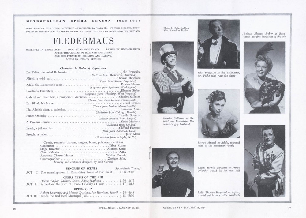 Premiéra inscenace Netopýra, o níž Max Graf píše, byla 14. dubna 1956. Premiérové obsazení se s tím, které viděl Graf, shoduje v osobě Charlese Kullmana, Patrice Munselové, Johna Brownlee a Jacka Manna. Charles Kullmann (1903–1983) pocházel z New Havenu a měl německé předky. Roku 1931 zpíval například Pinkertona v berlínské Krollově opeře (jeho Čo-Čo-San byla Jarmila Novotná), v letech 1932–1936 byl současně členem Státní opery v Berlíně a ve Vídni. Roku 1938 zpíval Švandu v londýnské premiéře Švandy dudáka Jaromíra Weinbergera. Čtvrt století byl členem Metropolitní opery. Pro Patrice Munsel (nar. 1925) byla role Adély jednou z jejích parádních rolí; když opustila operu, věnovala se muzikálu a filmovému herectví. Premiérovou Rosalindou byla Eleanor Steber (1914–1990), členka MET od roku 1940, kde debutovala jako Sophie v Rosenkavalieru. Tenorista Brian Sullivan (1919–1969), původně baryton, zpíval např. roku 1946 ve světové premiéře opery Kurta Weilla Street Scene, v MET debutoval o dva roky později jako Brittenův Peter Grimes, jejím členem byl do roku 1964. Premiérovým Alfredem však byl Gábor Carelli (1915–1999), rodák z Budapešti, v MET angažován v letech 1951–1974. Max Graf nejmenuje představitelku Prince Orlofského: tou byla altistka Blanche Thebom (1915–2010), rovněž v MET zpívala přes dvě desetiletí a především byla ceněná ve wagnerovských rolích. Dirigent Tibor Kozma (1909–1976), jak už jméno prozrazuje, byl maďarského původu, začínal v Drážďanech, ale musel utéci před nacisty a komplikovaným způsobem přes Ekvádor se dostal roku 1941 do New Yorku. Dirigoval v broadwayských divadlech, v MET v letech 1950–1957 (mimo jiné nastudoval už roku 1954 koncertní uvedení Netopýra, v níž Charles Kullmann a Regina Resnik rovněž zpívali). V newyorské inscenaci Netopýra z roku 1956 hostovali ovšak také Jussi Björling (tehdy již ovšem zdravotně poznamenaný) nebo Cesare Siepi.