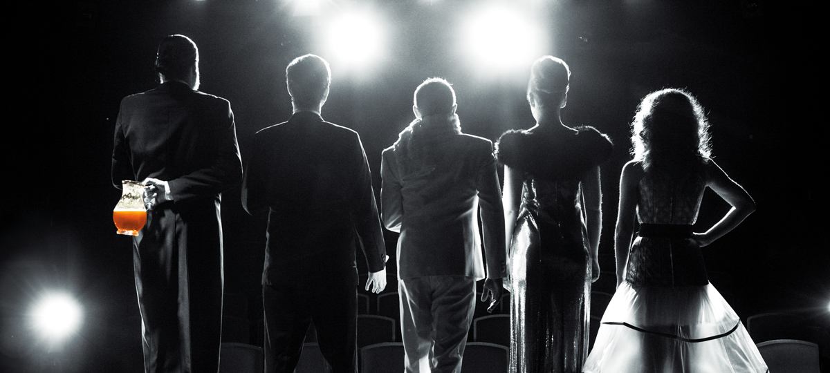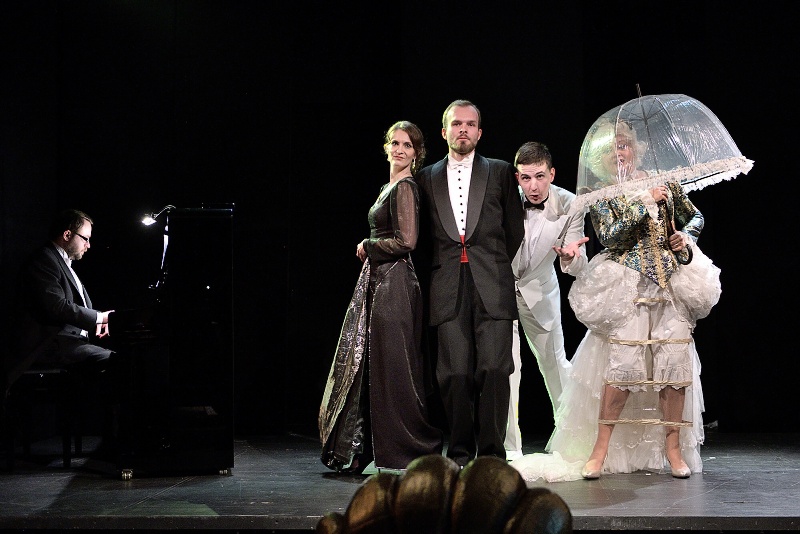 Ani charakteristika jednotlivých postav se nepovznesla k dynamičtější pestrosti. Sopranistka (Eva Dřízgová-Jirušová) se chová jako nafoukaná afektovaná primadona, která střídá pompézní extravagantní kostýmy a hlavně se vytahuje, jak ohromí svými lyrickými pěveckými kvalitami i virtuozitou, zatímco altistka kritizuje nesrozumitelnost její deklamace a všichni jsou dotčeni její nedochvilností. Se Sopranistkou se o přízeň atraktivního Barytonisty přetahuje závistivá, nicméně také sebevědomá Altistka (Anna Nitrová), která si hraje na femme fatale. Ve své dlouhé árii bez doprovodu si sice libuje, že si může přidávat nebo vypouštět noty, aniž to kromě skladatele, klavíristy a ostatních zpěváků někdo pozná, ale má nervy z toho, jestli se intonačně strefí do závěrečného „a“, kdy se to pozná, protože se k ní přidá klavír. Tenorista (Václav Morys), v bílém smokingu, si stěžuje, že má v celé opeře jedinou árií a nemůže uplatnit vysoké „cé“, i když je zrovna ve formě, zatímco Basista (Martin Gurbaľ) si libuje, že se po své jedné árii může vrátit (na pivo). Barytonista (Lukáš Bařák), v černém smokingu, tu je za typ barytonového elegantního kavalíra. Klavírista Michal Bárta si svědomitě hleděl svého partu a do děje se zapojoval jen minimálně.