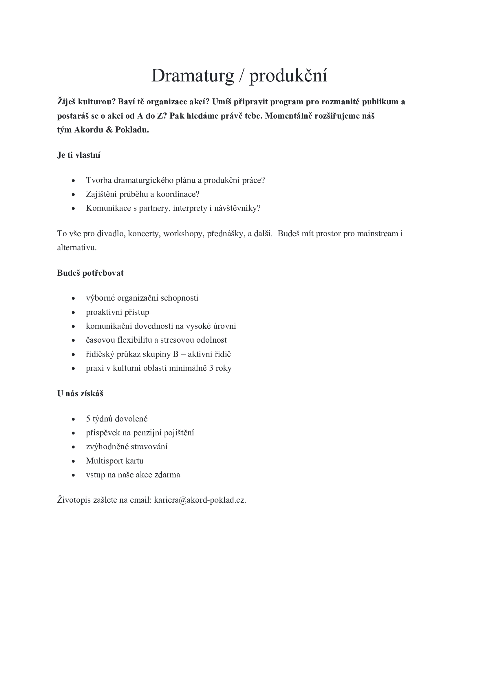 Čtení Kulturní a společenská centra AKORD & POKLAD s. r. o. v Ostravě-Zábřehu hledají dramaturga/dramaturgyni