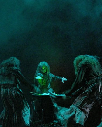 V podobně tradičním duchu se nese i scénické pojetí inscenace – uzavřený prostor skotského venkovského sídla dýchá rustikálností, solidností a jakousi rurální zemitostí, které na rozdíl od autorovy scény v Slovenském národním divadle již nejsou narušeny lapsy typu gotického chrámového okna. Sázkou na jistotu je i zahloubený prostor říše lesních víl ve druhém jednání, který se obejde bez výraznějších prostorotvorných prvků, originálním a vhodně zvoleným tahem je potom využití zprvu nenápadné projekce na horizont, která postupným přechodem barev mění i charakter denní doby celého výjevu.