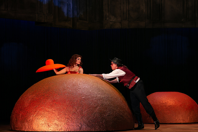 Asi nejkontroverznější nápad, který nemusí každému připadat estetický, je ztvárnění tří pomerančů v podobě obřích ženských ňader, která jezdí po jevišti (scénograf Boris Kudlička). Je to překvapivé, ale na druhé straně je to přirozenější výklad – že se muž zamiluje do tohoto atributu ženství spíše než do ovoce. A libreto pak dostává naprosto nový, dvojsmyslný význam. Začne to už ve strašidelné kuchyni, kde pomeranče střeží zabijácká Kuchařka, a ta má tři ňadra, jako vystřižená ze známého sci-fi Total Recall. Princ ji o ně připraví, když ji ošálí oranžovou stuhou. Spolu s věrným sluhou Truffaldinem pak svůj úlovek namáhavě valí pouští. Vysilující žízeň přiměje Truffaldina šťavnaté pomeranče naříznout (trochu bolestná představa) a objeví v nich ukryté princezny. Jejich klobouky tvořily celou dobu hroty ohromných ňader…