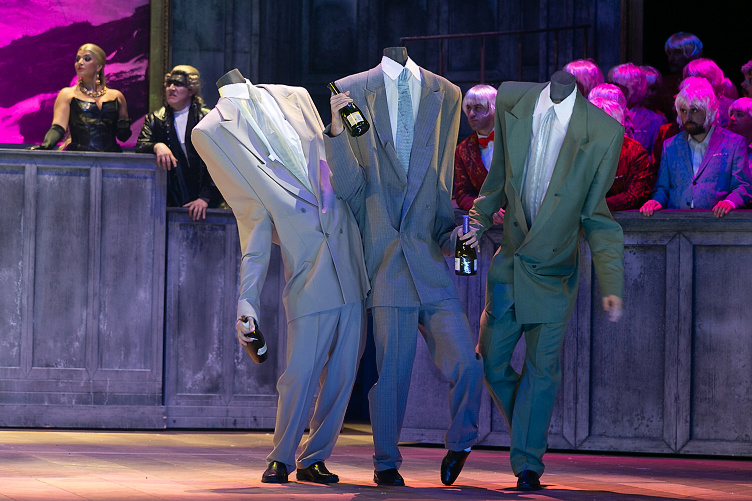 Prokofjev zarámoval pohádkový děj ironickou disputací učenců, dvou znesvářených táborů tragiků a komiků, kteří se přou, jak má vypadat správná divadelní hra. Také tu máme akční skupinu „mužů v černém“, v zajímavých moderních overalech a černých brýlích, fandících hlavně zábavě. Užívají si jazzových rytmů, tance a plní v inscenaci řadu dalších úkolů.