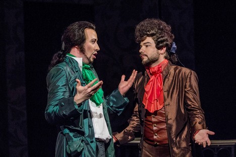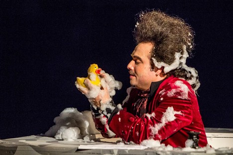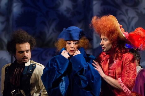Čekala nás mnohá překvapení, převleková komedie se rozšířila z osoby hraběte Almavivy (Lindora) prakticky na všechny postavy známého příběhu a myslím si, že právě všeobecný převlekový mumraj prvního bláznivého finále byl spolu s jeho prodloužením do začátku druhého jednání suverénně nejvtipnější situací inscenace. Ve chvíli, kdy je v kostýmu Dona Basilia oblečená nezpívající komorná Berta a Basilio v jejích starorůžových šatech včetně kloboučku snaživě zpívá svou roli, aniž by si jej kdokoli z ostatních všímal (což oba pochopitelně snášejí s narůstajícím neklidem), byl nesporným vrcholem inscenačního balábile. Nápadů je v Lazebníkovi hodně a mnohé gagy vycházejí, trochu mě však překvapilo, že paní režisérka, zdá se, považuje Lazebníka za dílo obecně známé, s prostým dějem a s jednoduchými postavami a patrně proto ději nepřikládá význam a víceméně jej nahrazuje řetězením komických situací a gagů.