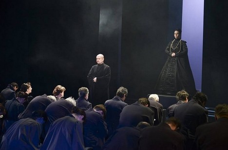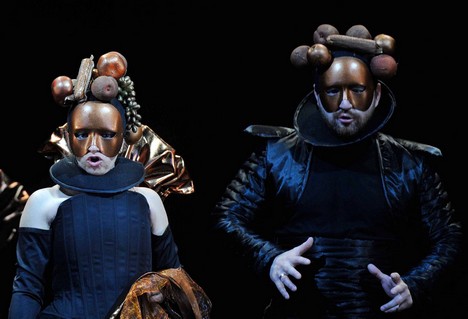 Tato syntéza se však povedla za cenu mírných přešlapů: Velmi efektní obraz Rudolfova dvora, který patří z hudebního i režijního hlediska k nejbrilantnějším, zároveň kombinuje všechno to nejznámější, co o rudolfinském dvoře víme. To vše dohromady z režijního hlediska působí trochu, jako když pejsek s kočičkou pekli dort – na jedné hromadě se ocitnou alchymisté, katolický a protestantský kněz v družném hovoru s rabi Löwem, kterého ještě pro jistotu, kdyby ho někdo nepoznal, režie vybavila malou figurkou Golema. Do toho všeho se objeví ještě malíř Arcimboldo s plátnem a před zraky diváků posledními tahy štětce právě dokončí slavný portrét Rudolfa jako Vertumna. Za velmi komplikované lze považovat zejména režijní ztvárnění apokalyptických vizí Kateřiny po roztržce se synem, kdy její válečné vidiny obsahují i tragické scény a situace z moderních dějin. To je z dramatického hlediska lákavý a také často užívaný efekt, nesmí ovšem zůstat v prvním plánu. V opeře se tak objeví hajlující Hitler a snad Mao Ce-tung (zdravící ovšem španělským pozdravem frankistů), k tomu baletky s kladivem a srpem (další dort pejska a kočičky?). V celkovém vyznění režie jsou však tyto „přešlapy“ nevýznamné a její syntetizující úlohu nijak nenarušují.