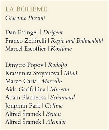 Dnes večer přenášená inscenace Pucciniho Bohémy v režii a výpravě Franca Zeffirelliho měla ve Vídeňské státní opeře premiéru skoro na den přesně před jednapadesáti (!) lety, 3. listopadu 1963 s Herbertem von Karajanem u dirigentského pultu, Mirella Freni byla Mimi a Gianni Raimondi Rudolfem.