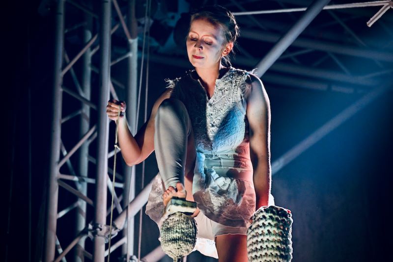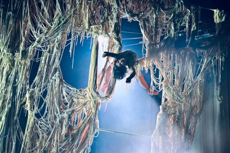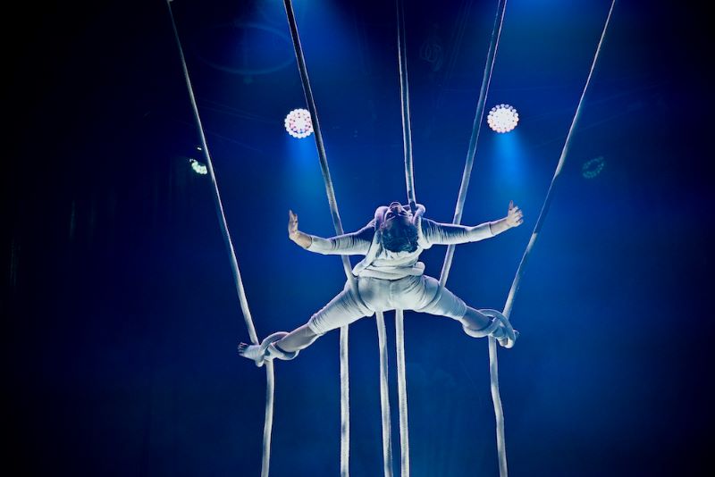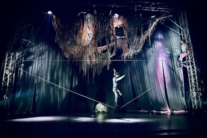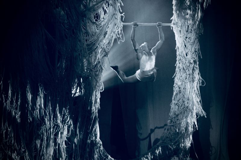 Ze všech setkání a duetů postav, které na jevišti splétají a rozplétají své osudy a vztahy, utkví jistě výkony akrobacie na laně. Alexander Weibel Weibel si publikum získal už dovedností při chůzi na něm hrát na housle, a jejich úžas dovedl k vrcholu, když číslo doplnil ještě o jednokolku. Jeho pravidelné návraty na scénu a hudební výstupy dávají inscenaci rytmus. Stejně tak se dočkal velkého ohlasu duet performerů, jimž ke sblížení ve variacích stoje na rukou sloužil právě vratký povrch největší koule (Aino Ihanainen a Mikael Kristiansen). Tiziana Prota, která jako jediná oblékla červené šaty, napnula nervy publika výstupem na hrazdě, z níž její kolegové postupně uvolňovali a odplétali jednotlivé příčky, ale na přeskáčku a neočekávaně. Překrásně poetické bylo společné splétání zvonu (či provazové klece?) v konstrukci, v níž byli všichni performeři zavěšeni jako ptáčci na bidýlku.