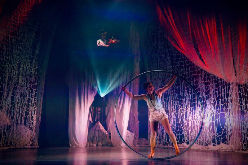Diváky vítá na proscéniu akrobatka, která z velkého klubka příze splétá bez jehlic síťovaná andělská křídla. Když se křehké tkanivo začne opět rozpadat, je jasné, o jakém úkolu se zde bude hrát a že je v něm také obsažena výzva směřující k divákům. Celá inscenace je postavená především na propracované scénografii. Lana, provazy, pravidelné tvary, sítě a síťky občas připomínají přetékající sněhovou závěj, jindy cáry mraků nebo plížící se mlhy, mírně evokují ledové království Zimní královny, které je potřeba rozehřát teplem lidského srdce. Sítě jsou jako jinovatka i jako cukrová drobenka na koláči, jako pavoučí vlákna, která mají moc uchvátit kořist, i jako šlahouny statné rostliny. Jak říká jedna filmová postava: Celá zem je zapletená do sítí. Každý rozestírá sítě. Někdo odvážně a chytře, někdo lstivě a sprostě. Cirkusoví akrobaté zaplétají do sítě svých epizodek a příběhů publikum. Nadmíru odvážně.