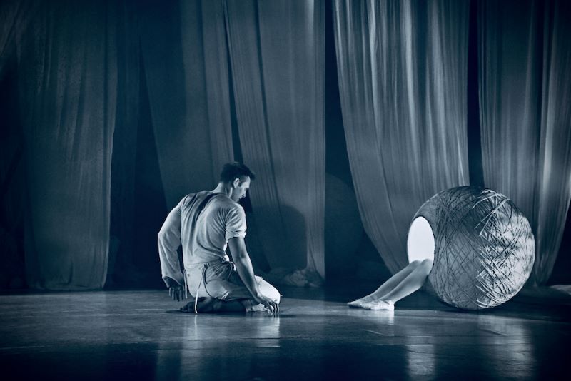 Máme se však soustředit na páry umělců a jejich komunikaci, i jakési námluvy a milostná toužení. Přítomná je i jistá dětská nevinnost podporovaná občasnou manipulací s háčkovanými panenkami i samotným motivem klubíček. Dění je situováno především ve vzduchu: v sítích, na lanech, nebo alespoň na velkých sférách imitujících obří klubka vlny, v nichž se ale může ukrývat třeba i další performer. Spolu s pohybem největší z nich, která díky tomuto úkrytu dovoluje další triky než jen balancování a slouží jako multifunkční rekvizita, vzpomněla jsem si na originální scénografii Aviottova Rendez-vous, kde architekt Miloslav Heřmánek vytvořil nadrozměrnou sféru s hlubokým reliéfem pro lidskou postavu, takže performer se mohl po scéně pohybovat jako její fyzická součást… Je ještě tolik možností, jak využít prostorovou geometrii.