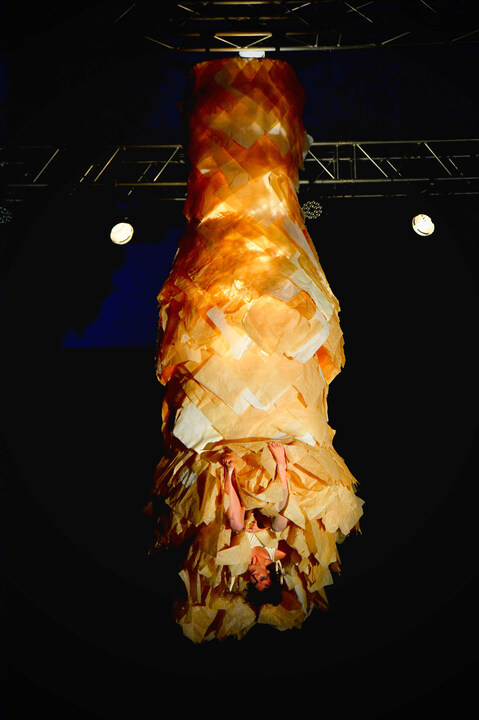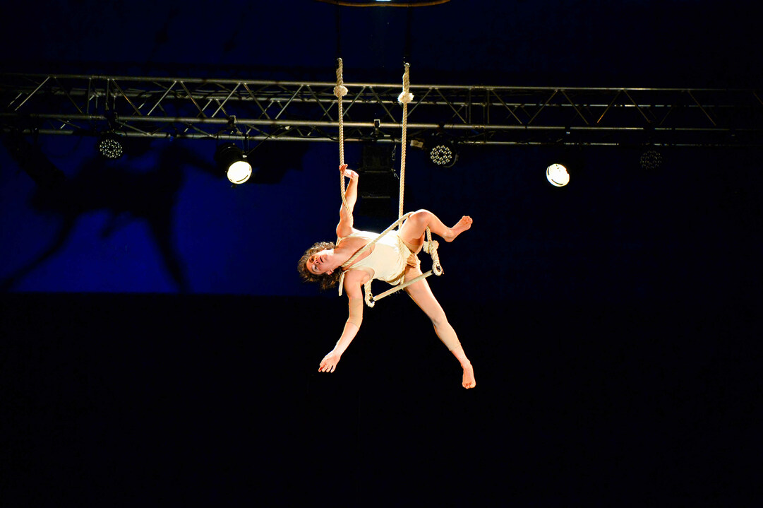 Už u tance obdivujeme, pokud tanečníci v páru často jen zaklesnuti do sebe zkoumají, kam až je pustí těžiště do volného prostoru. Zde jde výkon do extrémní polohy, protože se nedrží rukama, a navíc se dráha prodlužuje a tah zvyšuje přidáním různě dlouhých lan. Je to akrobatické zrcadlo principů, které v tanci rozpracoval a zpopularizoval William Forsythe. Představte si In the Middle, ale se dvěma muži a jejich těly, která se prostorem pohybují spojená jako pupeční šňůrou, ale skrývají ji v ústech. Obdivuhodné je samo technické provedení, jistota a partnerská práce. Využívají nejen bezkontaktního vedení síly přes lanka a karabiny, ale doplňují je i o fyzickou párovou akrobacii, napínající šlachy i klouby do krajnosti (cynik by mohl uvažovat, zda se jim jejich umění vymstí dříve na zubech nebo na meniscích…)