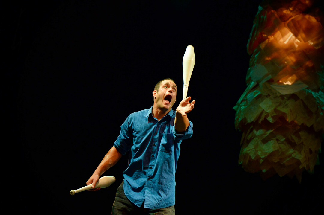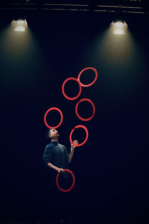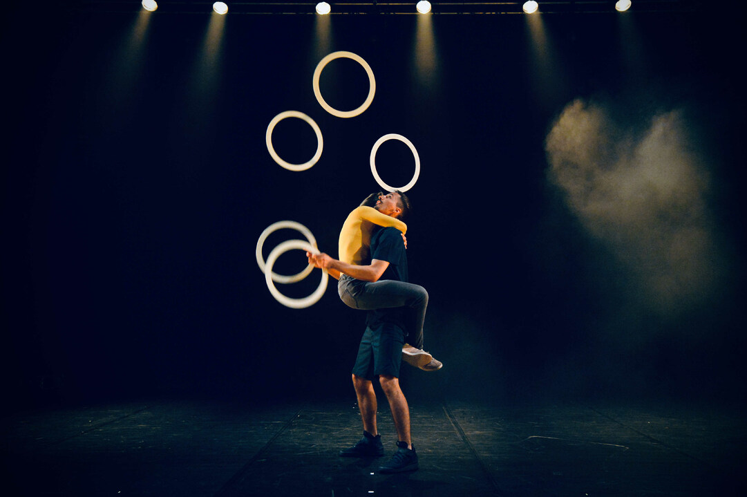 Michaela Stará odložila pingpongové míčky a v etudě ACT si vzala na paškál hůlku, která předurčuje i geometrii tvarů a drah. S využitím fyzického mimu se s předmětem střídala v akci a vdechla mu zdánlivý život a vlastní vůli. Taneční prvky se také neúprosně derou na povrch. Žonglérský duet s Filipem Zahradnickým diváky rozehřál ještě více, performeři se na scéně doplňovali a choreografie, můžeme-li tak nazvat i pohybový tok novocirkusových triků, se plasticky přelévala a pár performeru skutečně zapůsobil tanečním dojmem. Filip Zahradnický má ve svých vystoupeních vždy rozměr lyriky a zasněné fantazie. Sám to předvedl s etudou, v níž ze žonglovacích kruhů vytvářel spojené objekty s křídly, připomínající letící hmyz nebo ptáka. Jemná poetická hříčka podaná s lehkostí a profesionalitou byla bezpochyby jedním z nejlepších čísel večera.