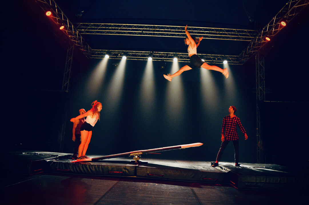 Akrobat Jihlava představil své svěřence ve dvou možno říci choreografiích, protože podstatná byla jak disciplína, tak práce s prostorem, stylizace pohybu v přechodech a celkové vizuální vyznění. První číslo pro dvě dívky a jednoho akrobata, tři židle a dvě visuté hrazdy tedy bylo etudou s důrazem na estetiku. V druhém čísle se mladá interpretka zaměřila na náročnou disciplínu visu za vlasy a akrobacii na závěsném kruhu. Z její flexibility a velkých rozsahů i tanečně laděných pohybů byla patrná předchozí zkušenost v gymnastice.