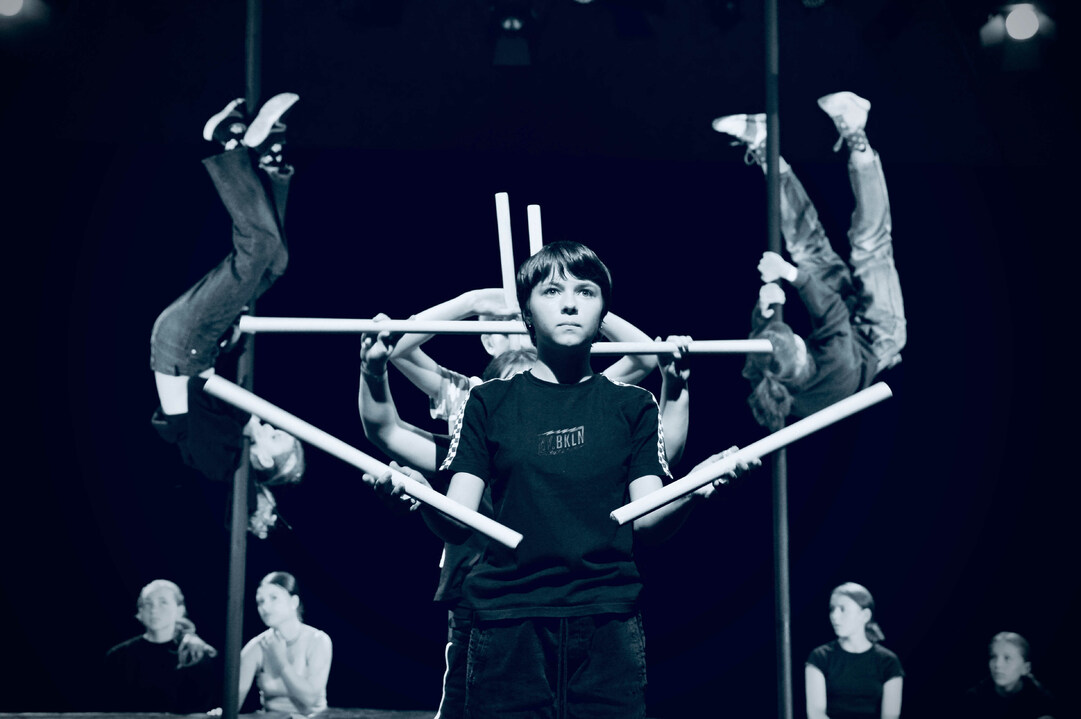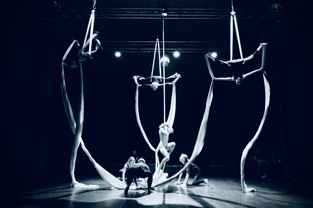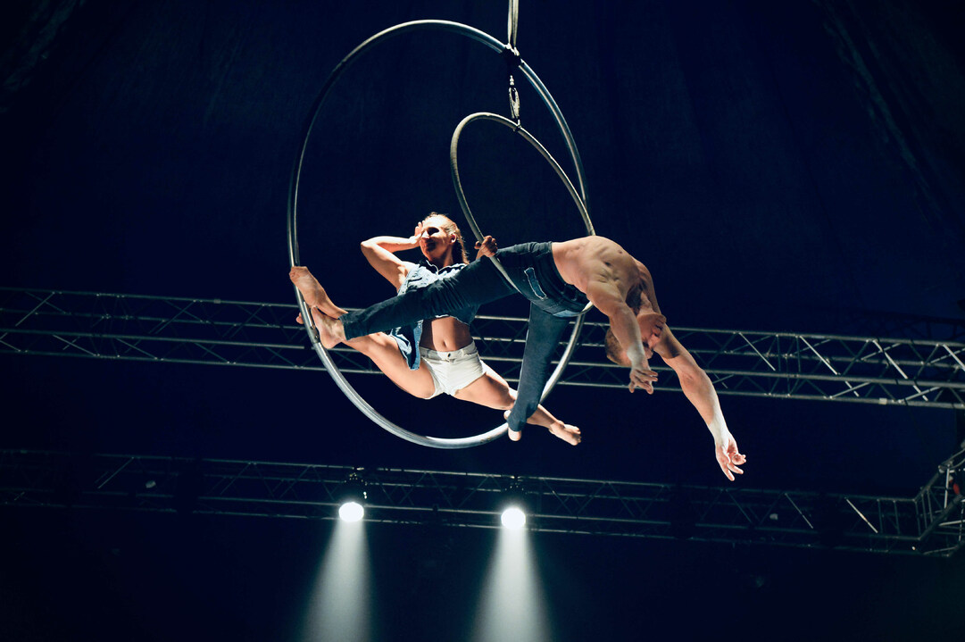 Neméně důležitá než virtuozita vlastního provedení je ale i divadelní kvalita celého duetu, a možná i důležitější. Choreografie, můžeme-li si troufnout použít taneční označení, je vystavěna trochu jako zápas, jak už to u sourozeneckých vztahů bývá, zároveň oplývá siláckou něhou, aspektem důvěry, s níž víme, že když jde do tuhého, jdou všechny rozmíšky stranou. Vzájemné drobné provokace a hecování k tomu, kdo zajde do jaké krajnosti, narůstají. Performeři se pohybují nejen po břevnu, které jejich malý stan půlí na dvě části, ale pouštějí se i do náročné závěsné akrobacie, která hraničí s fyzickými možnostmi. Ale přitom to není prvoplánový efekt, co činí jejich duet tak přitažlivým, ale jejich vzájemná souhra, způsob, jímž vypointují jednotlivé obrazy, které do sebe zapadají jako výstup na osmitisícovku od základního tábora po vrchol. Působivé je nejen ono číslo v přímém závěsu u stropu šapitó, ale i čistokrevně fyzické propojení v bratrském polibku, když už žádné karabiny a lana nejsou, souboj, zápas smísený s divokým tancem, ve kterém přitom probublává poselství jedné krve.