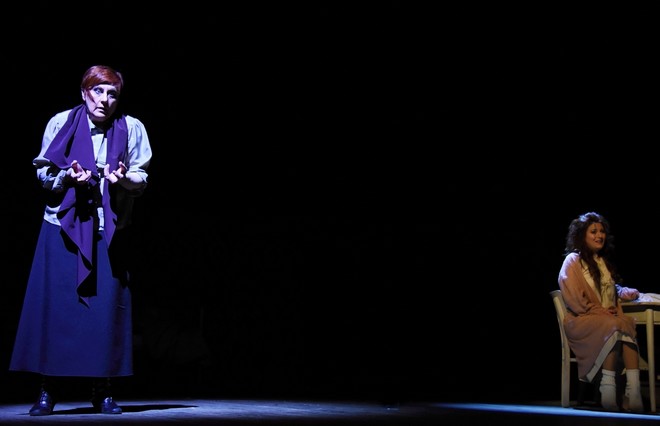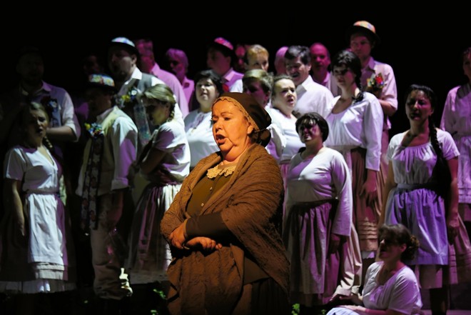 Kostelnička se potácí po jevišti a při životě ji drží jen touha provdat Jenůfku za člověka, který ji miluje a postará se o ni. Krutý zlom ve chvíli, kdy chce dvojici požehnat, nalezení dítěte pod ledem potoka, ji paradoxně vrací znovu k životu. Jenůfa přichází o další opěrný bod, o matku, která byla pro ni člověkem nejbližším, jemuž naprosto důvěřovala, a teď se stala tím, kdo jí nejvíc ublížil. Přesto je schopná si uvědomit, že by její pěstounka byla bez jejího odpuštění naprosto ztracena. Od „silné“ Kostelničky se miska vah převrací k silnější a vyzrálejší Jenůfě. Kostelnička ji dobře vychovala. I proto může Jenůfka v sobě najít skutečnou lásku k Lacovi, „tu větší, s níž Pánbůh spokojen“. Takto logicky interpretuje Linda Keprtová v jednoduché scénografii Marie Blažkové strhující příběh. Scénu řeší shakespearovsky, zvýšené patro a v prvním jednání také terasovité členění na levé straně jeviště plně využívá. Nepotřebuje ani obrázek Panny Marie, k němuž se Jenůfka modlí, stačí modifikace osvětlení. Dění na scéně jde ruku v ruce s hudební podobou inscenace. A pak následuje Janáčkův původní závěr opery, stručné orchestrální vyvrcholení, pětkrát opakovaný motiv zakončený lakonickým vyústěním. Není třeba Kovařovicových hymnických dodatků, příběh skončil.