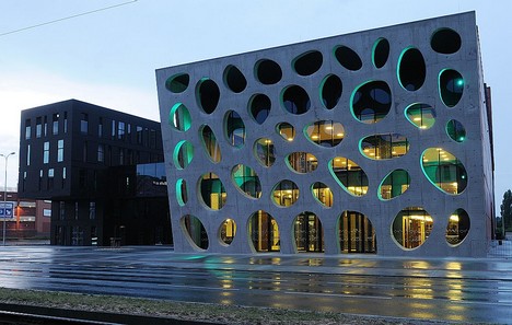 Dominantním architektonickým prvkem objektu je vstupní fasáda evokující divadelní oponu, jež se v mírném úhlu naklání nad příchozí a vyzývá je ke vstupu. „Oponu“ o rozměrech 21,8 krát 13,8 krát 0,60 metrů tvoří čtyřicet nepravidelných bublin, z nichž třemi se do budovy vchází. Na stavbě se denně pohybovalo zhruba dvě stě padesát pracovníků zhotovitelské firmy Hochtief a jejích subdodavatelů.