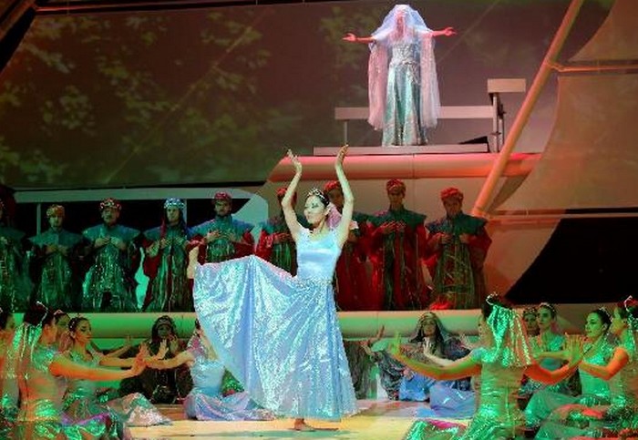 Vlastní paluba lodi, situovaná v několika plánech, je vlastně jevištní plochou o poměrně velké hloubce, tak aby se vešly sbory. Z centrálního pohledu je však perspektiva daleko plošší a v některých momentech při zajímavém nasvětlení budí dojem orientálních stínových loutkových her. Režisér s velkým výtvarným citem zvláště ve hře se světlem podtrhuje přesně vyznění hudebních nálad Bizetova díla. Po obou stranách hrací plochy jsou umístěna plátna, na která se promítají kontinuálně detailní záběry pořizované televizními kamerami. Orchestr je klasicky umístěn před jevištěm. Pro tak velký prostor, ve kterém je umístěno okolo čtyř tisíc diváku, je potřebné umělé ozvučení. To bylo někdy na můj vkus až příliš intenzivní a vyznívající ve prospěch hlasů. Projevil se ale takový efekt, že bylo slyšet sebemenší vokální chybičku, kterou by v klasickém divadelním sále orchestr lehce překryl. Velká zvuková hutnost je dnes pro takové produkce samozřejmým doprovodným jevem. Ideální a velmi vyvážená je třeba amplifikace operních představení v rakouském Bregenzu, ovšem v otevřeném prostoru.