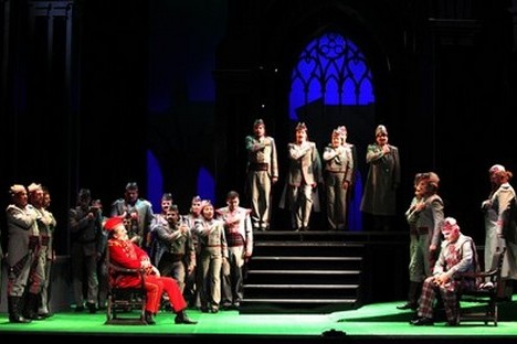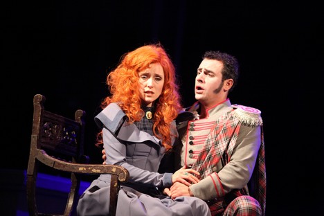 Keby sa Otava viac sústredil na profilovanie postáv čo sa týka psychológie, herectva, vzťahov, dalo by sa povedať, venoval sa bežnej režisérskej „rutine“ a budoval dramaticky účinné situácie a nerobil z romantickej látky politickú tragédiu, či drámu, i keď samozrejme i tieto podtexty libreta sú zaujímavé, vyšla by mu na javisku omnoho pôsobivejšia a sugestívnejšia inscenácia. Bohužiaľ celú dobu som mal pocit, že speváci sú ponechaní sami na seba, okrem pár základných pokynov, čo má kto kedy chytiť, priniesť, urobiť. Scéna Jána Zavarského je jedna z najkrajších, aké sme v tejto sezóne zatiaľ videli. Cituje slávne romantické obrazy, gotická architektúra sa opája mihotavou hrou svetiel, tieňa, nie je popisná, je architektonicky i výtvarne pôsobivá. Zato kostýmy Aleša Valáška, ktoré podľa režiséra nemajú byť dobovo ilustratívne „spíš jsme se inspirovali skotskými motivy a uměním romantismu“, majú z romantizmu možno iba tak spodničku. Nedomyslené, nezaujímavé a odpudivé kostýmy kazia dojem ako zo scénografie, tak i z réžie. Nápad obliecť ženy do uniforiem by nebol sám o sebe nezaujímavý, ale pokiaľ režisér hovorí o nebezpečenstve, v programe opisuje, ako každý účastník môže umrieť, ako môžu hrad prepadnúť nepriatelia, ako všade číha smrť, ako žijú v ruine, tak zbor v uniformách vyzerá, že vyšiel z nejakej romantickej operetky, ktorá sa teda neodohráva v stave obliehania v ťaživej Zavarského temne modrej, čierno-čiernej nočnej oblohe. Súčasné látky s motívom kociek sú priam do očí bijúce, pretože s elegantnými škótskymi vzormi kára ani z diaľky nemajú moc spoločného. A vojenské lodičky na hlavách oných verných statočných vojakov, ktorí na sebe nemajú jedinú škvrnku, sú ako z prehliadky na Hlavnom námestí. Samozrejme Raimondo ako hradný kaplán nemá sutanu, ale čierny oblek s kolárikom a na hrudi výrazný kríž, aby si ho nikto nesplietol trebárs s členom ochranky.