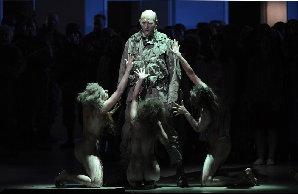 Verdiho Macbeth se v pojetí režiséra Philippa Himmelmanna v Semperově opeře hraje už od roku 2005. Navzdory vnějškové atraktivitě scény zkušeného Johannese Leiackera (zakroucená monumentální chodba jakéhosi anonymního úřadu skrývá za četnými dveřmi řadu překvapení, atmosféru jednotného prostoru působivě mění osvětlení Jana Seegera) se jedná o možná až příliš přímočarou alegorii na zničující i sebezničující touhu po moci. V současných kostýmech Bettiny Walter spřádají stále vyšinutější manželé Macbethovi své krvavé plány, aby je konzultovali s tlupou jakýchsi zombie čarodějnic a aby jejich provedením pověřovali šedou masu úředníků z přilehlých kanceláří. Ve výsledku působí inscenace trochu triviálně, a to především kvůli nedůslednosti, s jakou režisér jednotlivé situace dramatu domýšlí. Symbolické se střídá s realistickým, hororová atmosféra se satirou na odosobněný svět dnešních úřadů, tajemství zakrvácené dýky s věcností rychlopalné pušky M 16.