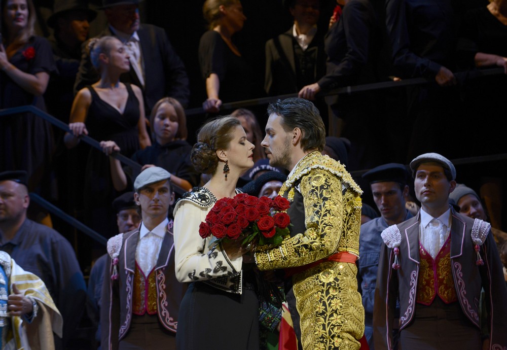 Představitele Escamilla, litevského basbarytonistu Kostase Smoriginase, jsem poprvé naživo zaznamenal v loňské produkci Carmen v rámci Salcburských velikonočních her. Nebyl jsem sám, kdo ho tehdy vedle Magdaleny Kožené, Jonase Kaufmanna a Genii Kühmeier označil za pěvecky i představitelsky nejslabší článek celého obsazení – angažmá pěvce tohoto typu jsem v takto prestižní inscenaci považoval téměř za nedorozumění… I po roce se obávám, že je Smoriginas pěvcem spíše průměrným, nicméně herecky působil v aktuální Köhlerově režii mnohem přesvědčivěji. Poživačný macho v rozhalené košili, pobavený návštěvník pašeráckého hnízda i falešně pobožný toreador představovaly polohy, které Smoriginasovi skutečně seděly.
