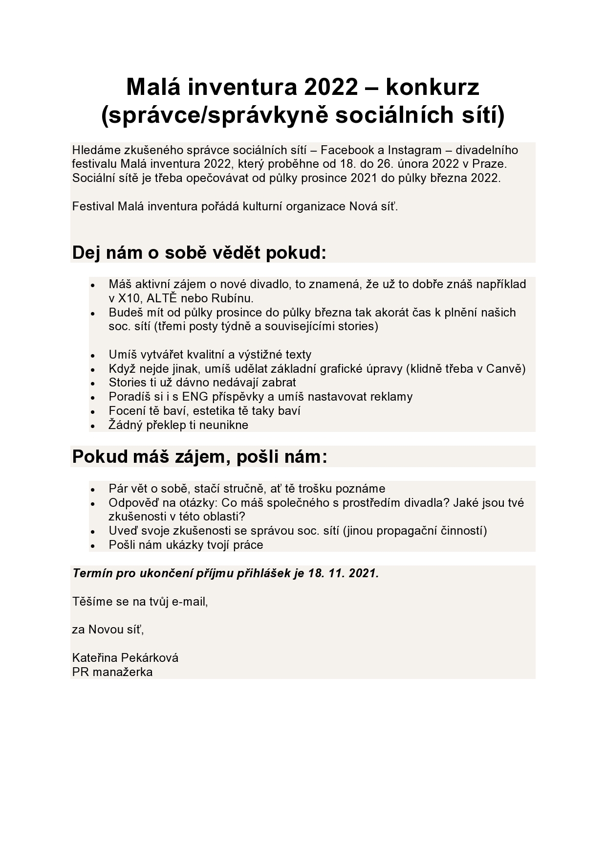 Malá inventura 2022 vypisuje konkurz na správce sociálních sítí