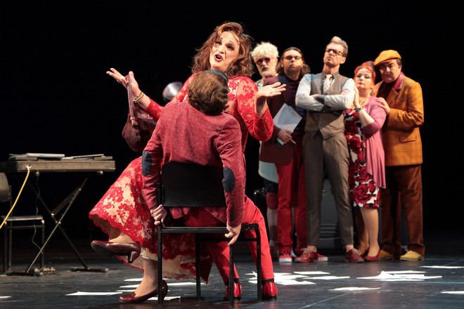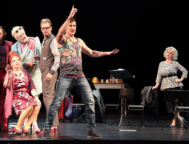 Inscenace je postavena na herecké i pěvecké interakci všech zúčastněných. Je zjevné, že režisér využil některé vlastnosti jednotlivých pěvců, kteří tak ve svých rolích karikují sami sebe. Každý z nich má v Dessau různorodý repertoár a určitě by bylo možné v inscenaci vysledovat narážky na jejich další více či méně významné role. Dialogy jsou jim psány doslova na tělo a lze jim – zejména s vědomím, že se celkově jedná o parodii na divadelní provoz – odpustit i jisté drobné prohřešky proti notovému zápisu. Všem byla o repríze 13. listopadu výborným partnerem Anhaltská filharmonie Dessau pod vedením Daniela Carlberga. Jeho hudební nastudování je svěží, má lehkost i belcantovou noblesu, dirigent navíc od dirigentského pultu hraje brilantně na klavír a v případě árie z Händelova Julia Caesara také na cembalo.