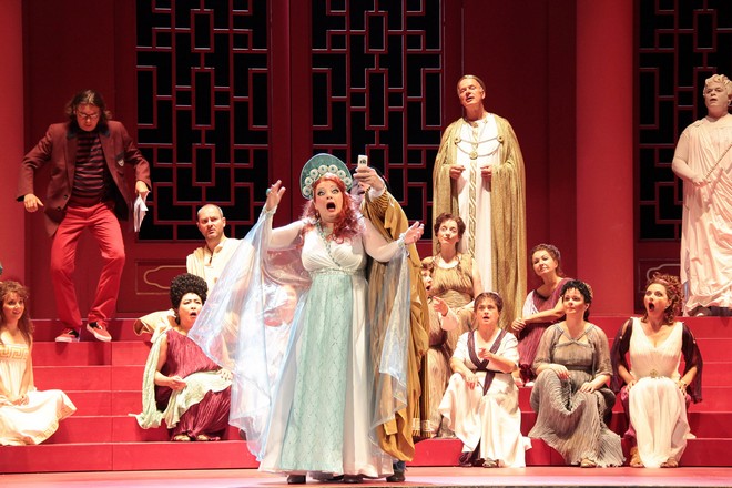 Úspěch této opery stojí a padá s obsazením právě matky Agáty, v kontextu operního repertoáru poměrně atypické role. V Dessau ji interpretuje i u nás velmi dobře známý basbarytonista Ulf Paulsen. V Praze byl například výborným Kurwenalem ve Wagnerově Tristanovi a Isoldě, Beltramem v Meyerbeerově Robertu ďáblovi nebo Amfortasem ve Wagnerově Parsifalovi, v Národním divadle moravskoslezském pak Friedrichem z Telramundu ve Wagnerově Lohengrinovi, Ismenem ve Dvořákově Armidě, Rarachem ve Smetanově Čertově stěně nebo Ruprechtem v Prokofjevově opeře Ohnivý anděl. Tyto role jsou přece jen poněkud vzdáleny Donizettiho belcantové frašce. Ulf Paulsen je mimochodem již patnáctou sezonu předním sólistou Anhaltského divadla a získal zde v minulé sezoně za interpretaci Wotana/Poutníka ve Wagnerově Prstenu Nibelungově titul komorní pěvec; v Donizettim ovšem prokázal neuvěřitelný smysl pro humor a také pro belcanto nezbytnou hlasovou flexibilitu. Jeho ztepilá, dvoumetrová matka Agáta, v červenobílých šatech s fialovou kabelkou, je hybatelkou děje i hnací silou celého toho jevištního komediálního ohňostroje. Pro to, aby své dceři dopomohla stát se první primadonou, je schopna prakticky čehokoliv. Nejprve bojuje slovy a zpěvem. Dožaduje se „spravedlnosti“ pro svou dceru a vyžaduje pro ni u skladatele samostatnou árii. V duetu s primadonou Dariou, která odmítá s mladou kolegyní vystupovat, se vyjadřuje ve smyslu, že už snad všichni vědí, že její Luigia je mnohem lepší než Callas, Scotto nebo Freni a je pro divadlo minimálně tak dobrá, jako byla kdysi pro Mariinské Anna Netrebko. Následně pomocí své kabelky použije i násilí, jen aby se zbavila dceřina tenorového nápadníka, a když se po něm zoufalý impresário shání, poznamená jen lakonicky: „Vrátil se zpátky do své galaxie.“ Jakékoliv další impresáriovy snahy matku Agátu zneškodnit skončí fiaskem, včetně pokusu o její zavření do masivní klece na rekvizity na samotném konci finále prvního jednání.