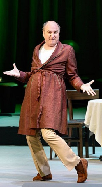 Je věcí vkusu, že se tu odehrává hon na soka se síťkou na motýly. A také bychom mohli říct, že fantazii režisérky pomalu dochází dech, když uvede do chodu obrovskou diskotékovou kouli. To už ale italské dvě a půl operní hodiny, kterým režisérka poskytla vitální služby, míří k cíli. Mistrovský kousek je první setkání starého svůdníka s vyhlédnutou nevěstou – ona předvádí cudnost téměř jako automat, on je groteskně vyšňořený nápadník, strašně nervózní a určitě to není špatný člověk. Jak se ten ubožák snaží ležérně točit šálou, pot strachu mu odplaví tupé. A tak dále. Michele Pertusi zpívá tohoto kavalíra „za pět minut dvanáct“ úctyhodně; především však nadchne hereckým kličkováním mezi chováním alfa samce a stařeckým bláznovstvím.
