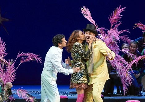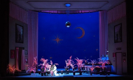 V tom případě nemůžeme namítat, že Irina Brook inscenuje operu jako ironii, jako snůšku nesmyslů. Don Pasquale je vedoucím současného, poněkud omšelého nočního klubu; když Ernesto zpívá své Norině zastaveníčko, děje se tak mezi blikajícímu růžovými miniaturními palmami (scéna Noëlle Ginefri-Corbel) a za doprovodu mexické skupiny, která vypadá tak neautenticky, jako by utekla Rexu Gildovi [nejznámější píseň tohoto německého zpěváka byla Fiesta Mexicana z roku 1972, pozn. V. R.].Odkud se ti lidé vzali? Nevíme. To, co vidíme, je následek „koupě“, kterou přihrál prohnaný šarlatán Malatesta Donu Pasqualovi. Po podpisu smlouvy se domněle sladká nevěsta promění v ďábla a staříkovi připraví peklo, když do interiéru jeho baru přenese fetiše z Někdo to rád blond (křiklavou růžovou a fotografie čivavy). Jde jen o to, vytáčet Pasquala tak dlouho, dokud se své nevěsty – ve skutečnosti velké lásky Ernestovy – nevzdá. A nezaplatí odstupné, pochopitelně.