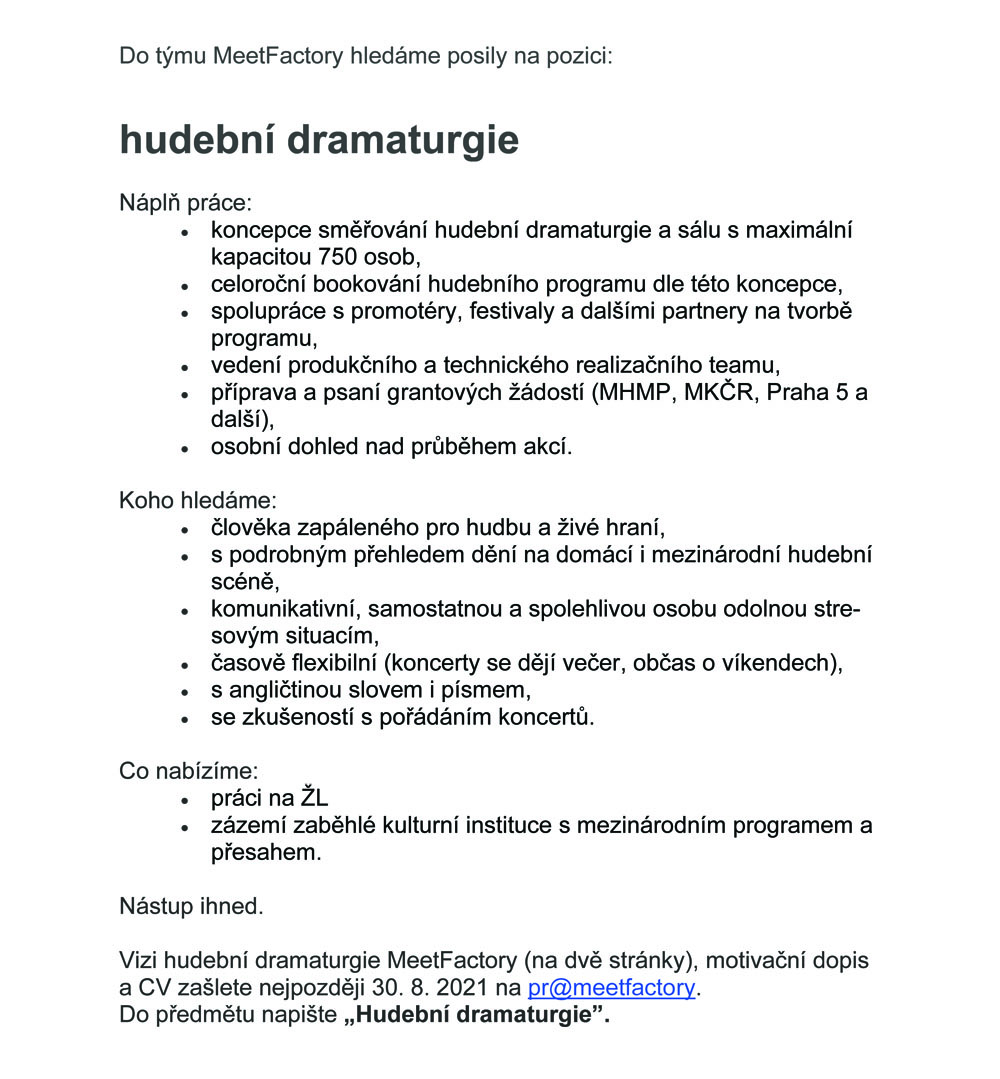 Inzerce MeetFactory hledá hudebního dramaturga Publikováno 14/08/2021 sdílejte: 0 minut čtení sdílejte: TémataSeznam inzerátů Sdílet článek Facebook email zkopíruj odkaz vytisknout sdílejte: Předchozí článek Jiří Bárta (nejen) o Mezinárodním hudebním festivalu Kutná Hora Další článek Operní panorama Heleny Havlíkové (331) – Letní slavnosti staré hudby napříč staletími i zeměmi 0 0 hlasy Ohodnoťte článek Odebírat Přihlášení Upozornit na nové a další komentáře nové odpovědi na můj komentář Label {} [+] Jméno* E-mail* Webová stránka Label {} [+] Jméno* E-mail* Webová stránka 0 Komentáře Nejstarší Nejnovější Most Voted Inline Feedbacks Zobrazit všechny komentáře Načíst další