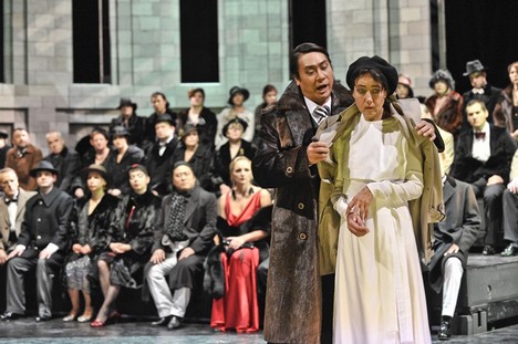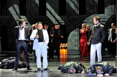 Shakespeare svou Vetu za vetu situoval do Vídně, Wagner na Sicilii. Zkušený činoherní a operní režisér a šéf meiningenského divadla Ansgar Haag (v letošním roce s velkým úspěchem režíroval v Brně zdařilou inscenaci Osudu Leoše Janáčka) dílu ponechal italský kolorit, časově jej však posunul do období nástupu Mussoliniho. Předkládá publiku jasný, vtipný příběh odehrávající se na nápaditě koncipované jednoduché scéně (Helge Ullman), která má několik výškových úrovní, čímž je prostor zdařile rozčleněn. Režisér v něm důmyslně prostřednictvím točen zcela plynule mění prostředí, přechází z jedné scény do druhé. Je nepochybné, že Ansgar Haag je vynikající režisér, který také dokáže s pěvci skvěle pracovat. Jeho režie a celkové vedení pěvců vychází od prvního do posledního taktu z hudby. Nenutí je k náročným či násilným akcím, plně respektuje obtížnost zpěvních partů, přitom v gestech, mimice i celkovém jednání jasně a jednoduše vypracuje postavy do posledního detailu. Divák je tedy svědkem nejen pěveckého, ale i velkého hereckého umění. Pěvci totiž hrají neuvěřitelně přesvědčivě. Přitom k tomu nepotřebují žádná velká gesta, žádné pobíhání. A excelentní herecké výkony skvěle podporují výkony pěvecké. Promyšleně jsou vystavěné i sborové scény. Třebaže jsou členové sboru vedeni individuálně, sbor působí jako jedno velké těleso, přitom není odsouzen k obyčejnému vytváření kulisy. A není rozbit zbytečnými akcemi. Síla sboru je zde v jeho jednotě a opět těžko postřehnutelných gestech, které ovšem ve svém výsledku sbor oživují. Zkrátka jedna složka inscenace do druhé bezvadně zapadá. Však se také publikum výborně bavilo. Časový posun u této komedie nikterak nevadí, ba naopak je Liebesverbot příkladem titulu, s nímž lze tímto způsobem pracovat. Škoda však, že si režisér neodpustil násilné politikum v posledních několika taktech díla, kdy v rozporu s Wagnerovou předlohou nedojde k radostnému usmíření, ale hromadné vraždě a vlády se ujímá nový diktátor. Jakkoliv si při zpětném pohledu uvědomíte, že se po celou dobu na scéně pohybovaly temné postavy ´tajných´, v průběhu inscenace je nijak důsledněji nevnímáte a ani jim nepřisuzujete zvláštní úlohu. Dobře se bavíte, prožíváte příběh, v němž sice o život jde, ale rovina zůstává odlehčená. Necháte na sebe působit hudbu. A pak v poslední minutě představení dostanete studenou sprchu. Škoda. Meiningenské publikum ovšem proti tomuto konci nikterak neprotestovalo a ocenilo výkon pěvců a orchestru tak, jak si zasloužili. Silným, dlouhotrvajícím aplausem a nadšeným voláním bravo.