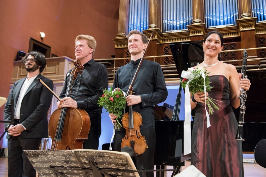 Po přestávce nastoupila na pódium klarinetistka Sharon Kam a klavírista Matan Porat, aby s Josefem Špačkem a Michalem Kaňkou uvedli Kvartet pro konec času Oliviera Messiaena. Skladba má zajímavou historii. Messiaen ji psal za války v německém zajateckém táboře ve Zhořelci (kousek od našich západních hranic), kde byl jako příslušník francouzské armády internován. Mezi zajatými byli tehdy i klarinetista, houslista a cellista, pro něž složil krátké trio. Později jej doplnil o klavír a v tomto složení je spolu provedli před stovkami zajatců v táboře – na chybějící cello se ještě vězni museli složit. Nebyl notový papír, všeho nedostatek. Je obdivuhodné, jak náročnou formu za těchto podmínek dokázali zvládnout. A jaká to asi byla zodpovědnost pro autora – jeho vyjadřovací prostředky nepatří k jednoduše líbivým, a jeho publikum nebyli hudební labužníci, vyhledávající nové experimenty. Kvartet je transcendentní, závažný, plný andělů, věčnosti a nesmrtelnosti, má nesmírně silné poselství. Vede posluchače temnými krajinami, pocitem bezčasí a ztráty, nekonečným nářkem až ke katarzi, ke krásnému zpěvu osvobozující duši. Myslím, že tomu museli posluchači, zvláště v situaci, v jaké byli, dobře rozumět.