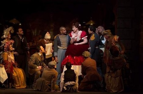 Objevuje se tu prvek Kde je Waldo? (poznámka překladatele: dětská obrázková kniha založená na hledání Walda v davu lidí, jako například na pouti, nádraží, pláži a tak dále). Hlavní sólisté se ztrácejí ve zmatené tlačenici a jejich hlasy bojují s nesčetnými aktivitami, které se kolem nich rozvíjejí. Okázalé kulisy (vyžadující dlouhé přestávky pro přestavbu) a široké množství komparsistů na jevišti však stále vyvolávají aplaus a uznalé povzdechy, když se zvedá opona. Totéž se stalo, když se ve středu večer tato inscenace opět vracela na jeviště Met v druhém obsazení sezony.