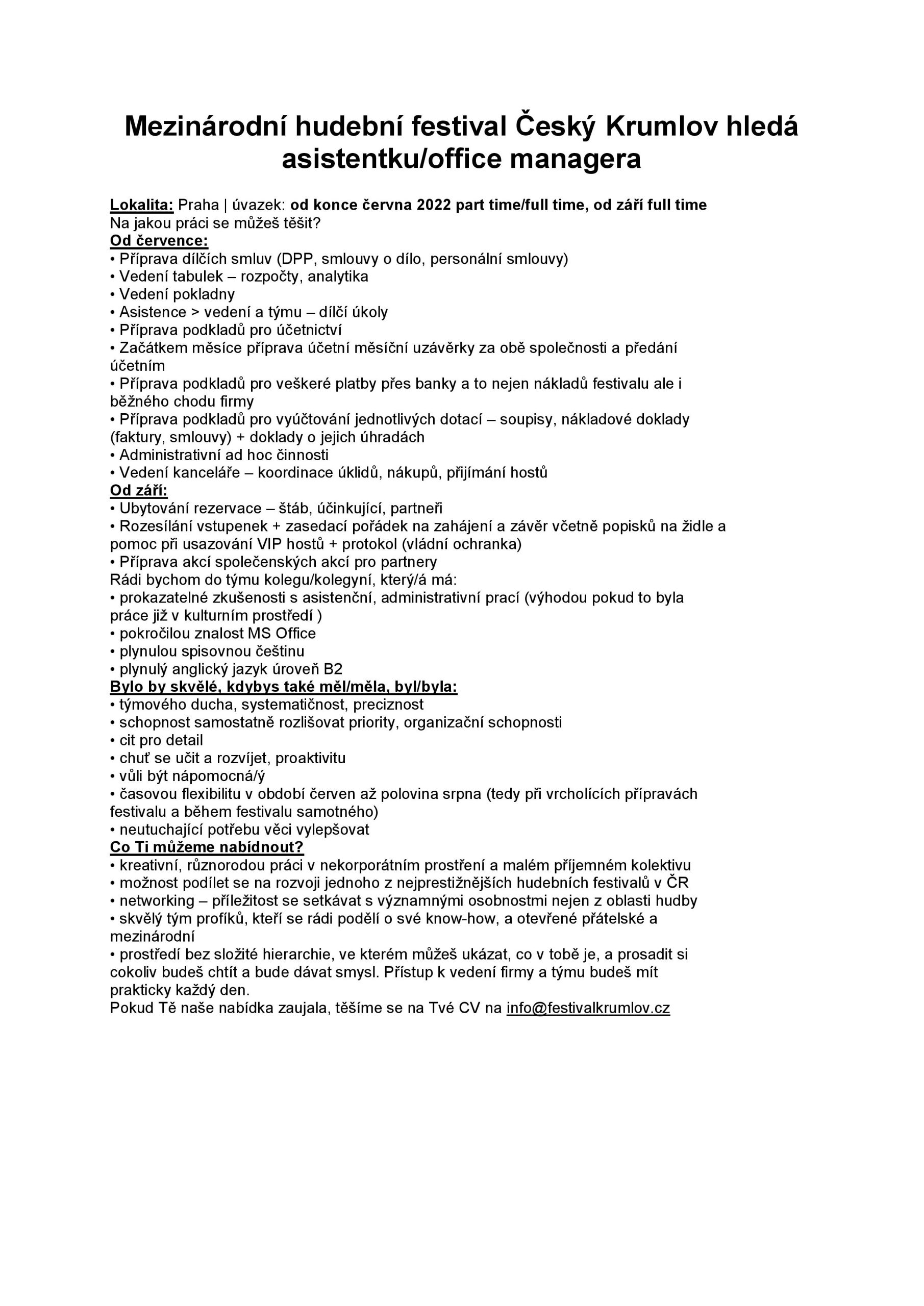 Inzerce Mezinárodní hudební festival Český Krumlov hledá asistentku / office managera Publikováno 24/06/2022 sdílejte: 0 minut čtení sdílejte: TémataSeznam inzerátů Sdílet článek Facebook email zkopíruj odkaz vytisknout sdílejte: Předchozí článek Cembalistka Edita Keglerová bude sólistkou koncertu ke 300. výročí narození J. A. Bendy Další článek Stations: Absolutní tanec, ke kterému není co dodat 0 0 hlasy Ohodnoťte článek Odebírat Přihlášení Upozornit na nové a další komentáře nové odpovědi na můj komentář Label {} [+] Jméno* E-mail* Webová stránka Label {} [+] Jméno* E-mail* Webová stránka 0 Komentáře Nejstarší Nejnovější Most Voted Inline Feedbacks Zobrazit všechny komentáře Načíst další