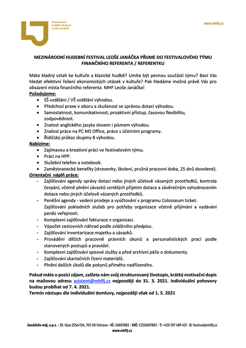 Čtení Mezinárodní hudební festival Leoše Janáčka přijme finančního referenta