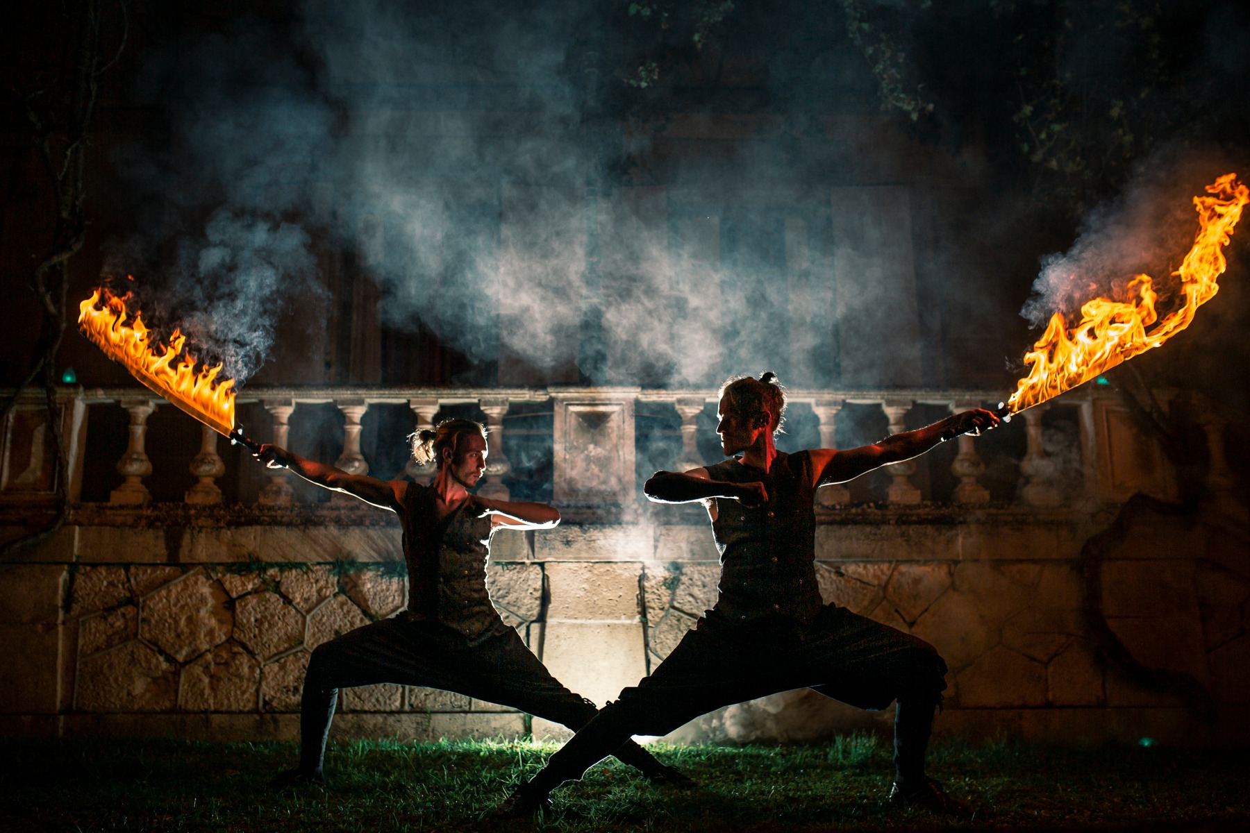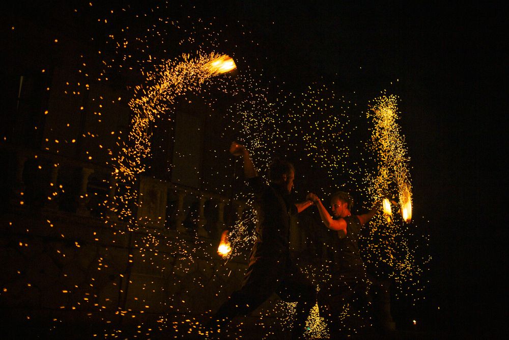 Kromě velkého gala, kterým je tradiční Mime Evening, se letos festival vydal opět pod širé nebe, ačkoli šlo o hru na ostří nože s počasím. Artista Vojta Stolbenko, který na festivalu vyučoval i workshop ve flow arts, uspořádal spolu se svým uměleckým souputníkem Tomem Horou u městských hradeb světelnou show, která vnesla na festival kouzlo pouličního kejklířství. A také atmosféru nebezpečí, kterou s sebou nese nový cirkus a artistické disciplíny. Manipulace živým ohněm patří nepochybně k motivům, které rezonují s naší prapodstatou: oheň je uctívaným symbolem domova, ale i ničivou silou, již je těžké ovládnout, a tak každý, kdo se stává jeho mistrem, získává v očích diváků punc nadpřirozena a magie. Záblesky světla z hořících mečů, pochodní a záplava žhavých jisker rozechvívají ve ztajeném nadšení to dětské, co je v lidské duši. Ještě chybí sokolníci a dotek dravé přírody…