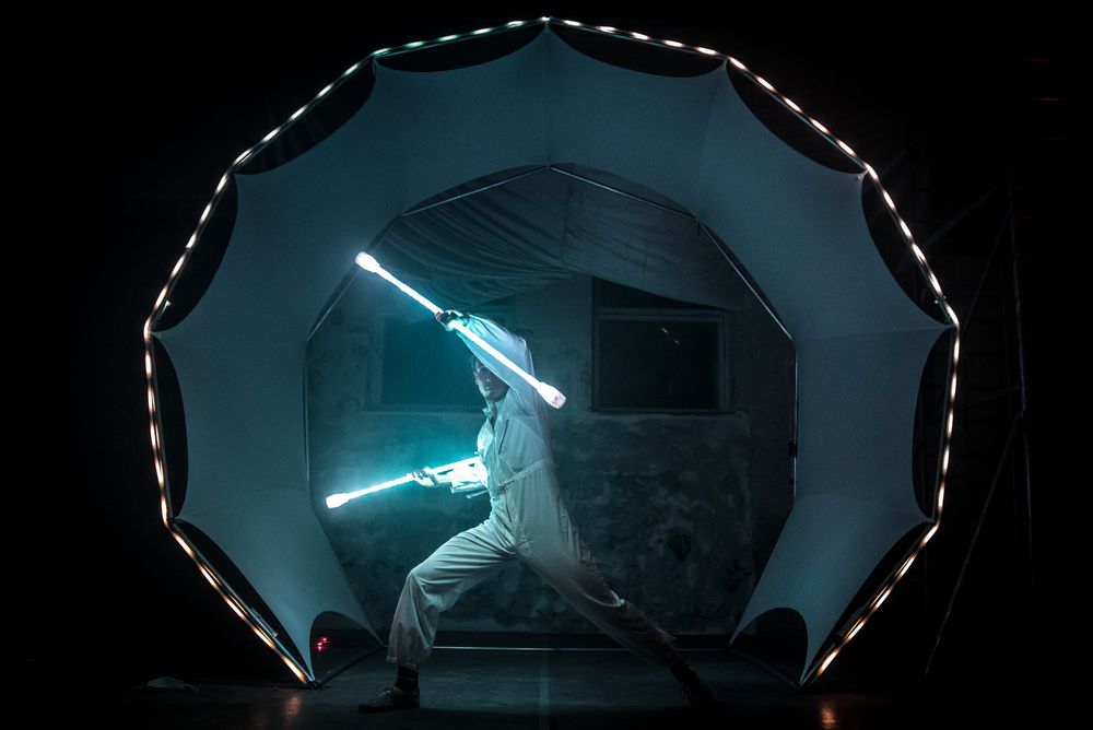 Program doplnil také žonglér Filip Zahradnický parádním číslem kombinujícím žonglování a balancování objektů, které završil stavbou pyramidy ze sklenic. Za nadšené podpory publika dovel ke zdárnému konci všechny roztodivné kombinace a podpořil festivalovou atmosféru. Z jeho další práce však víme, že ani on netvoří jen pro líbivý efekt, ale snaží se ve svých delších vystoupeních hledat na jevišti poezii. Vojta Stolbenko přivezl mini showcase možností, jak využít led světlo ve flow arts. K úspěchu je rovněž zapotřebí perfektního načasování, neboť naprogramovaná technika nečeká na člověka a účelem je iluze. Je možné hrát si s drobnými světelnými body, zdánlivě měnit gestem barvu či směr světelného toku, ale vždy být o setinu vteřiny napřed před výbojem. Viděli jsme plynulou manipulaci se svítidly větších i menších rozměrů, lákavé efekty, které vzbuzují otázku, jak je skutečně usměrnit, využít a třeba jen jako minimalistický doplněk pro okamžik velkého vyvrcholení a dramatického momentu využít v divadelní inscenaci. Publikum se samozřejmě baví a nechává unášet samotnou podívanou, a je to tak v pořádku.