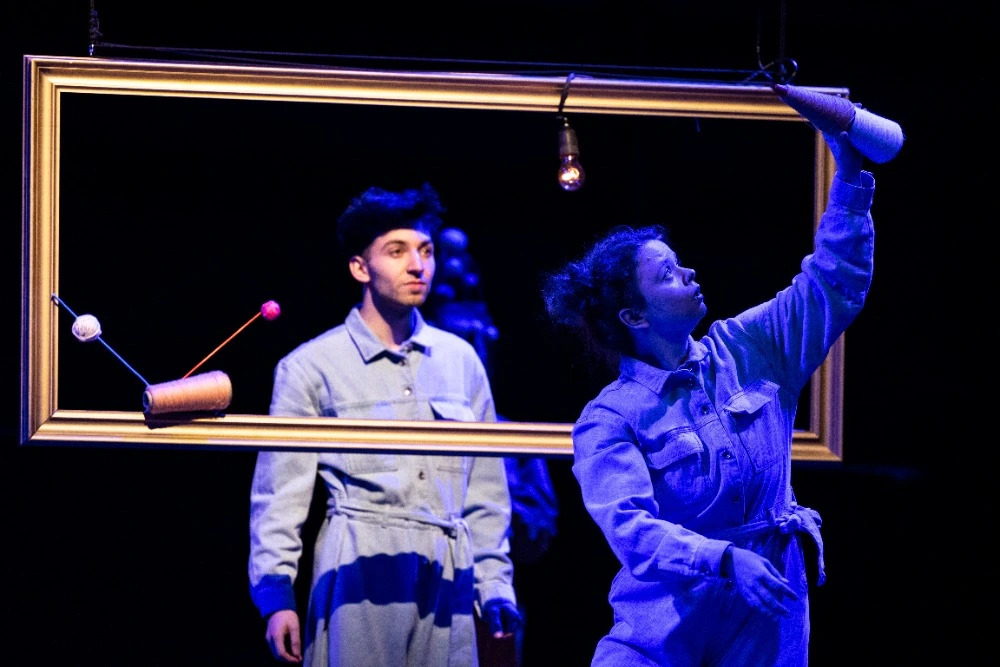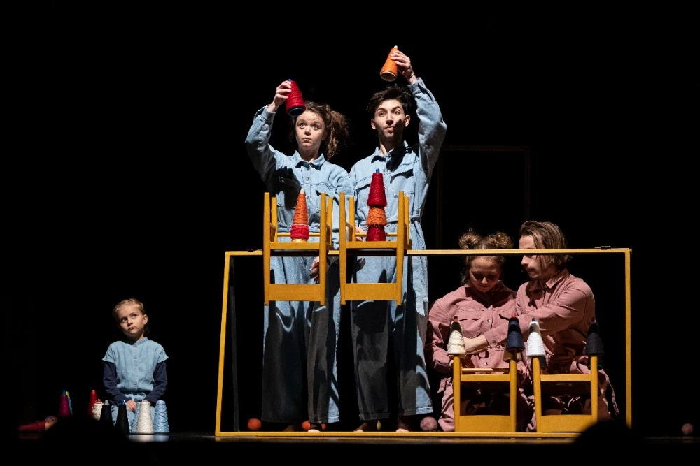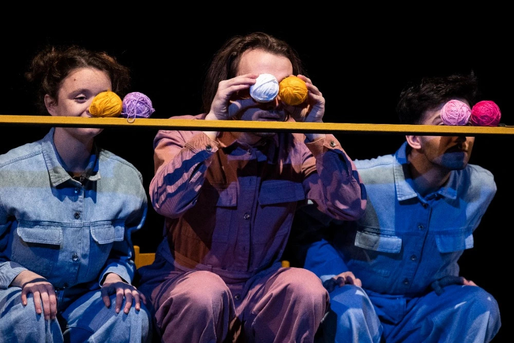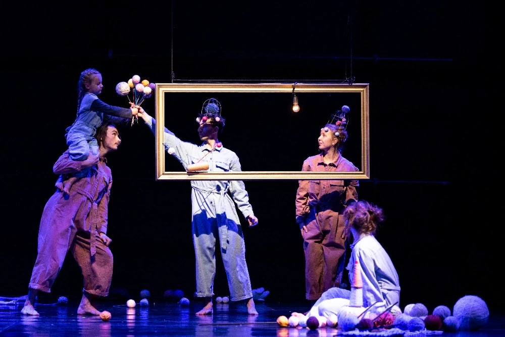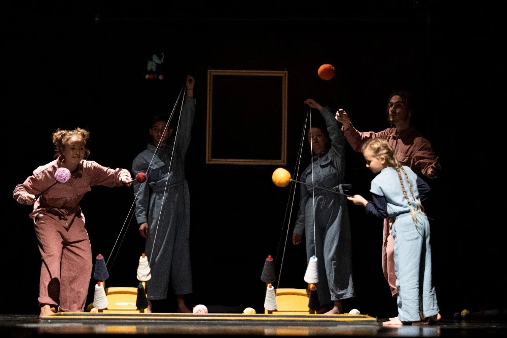 Od výchozího bodu se odvíjí příběh, který je záminkou k rozehrání stínového i pantomimického divadla i rafinované manipulaci s objekty. Není tu však nic zbytečného nebo okatě zdůrazňujícího techniku samotnou, ani pohled nebo krok navíc. Naopak je to velký prostor pro zapojení smyslů a malí diváci musí použít vlastní fantazii, aby se dostali do samotných útrob pletacích strojů, jež ožívají díky čtyřem performerům a několika rámům, jež mohou být stejně tak dobře okny či obrazy jako branami do světa imaginace. Dětské publikum se seznamuje s rozdílnou dynamikou pohybu, se zkratkou, klubíčka vlny se mohou stát očima a ušima, z cívek vzniká radiopřijímač i celé soukolí stroje. Je to především čistota prostoru pro fantazii, co je tak důležité u představení pro dětského diváka, a to se mu dostává.